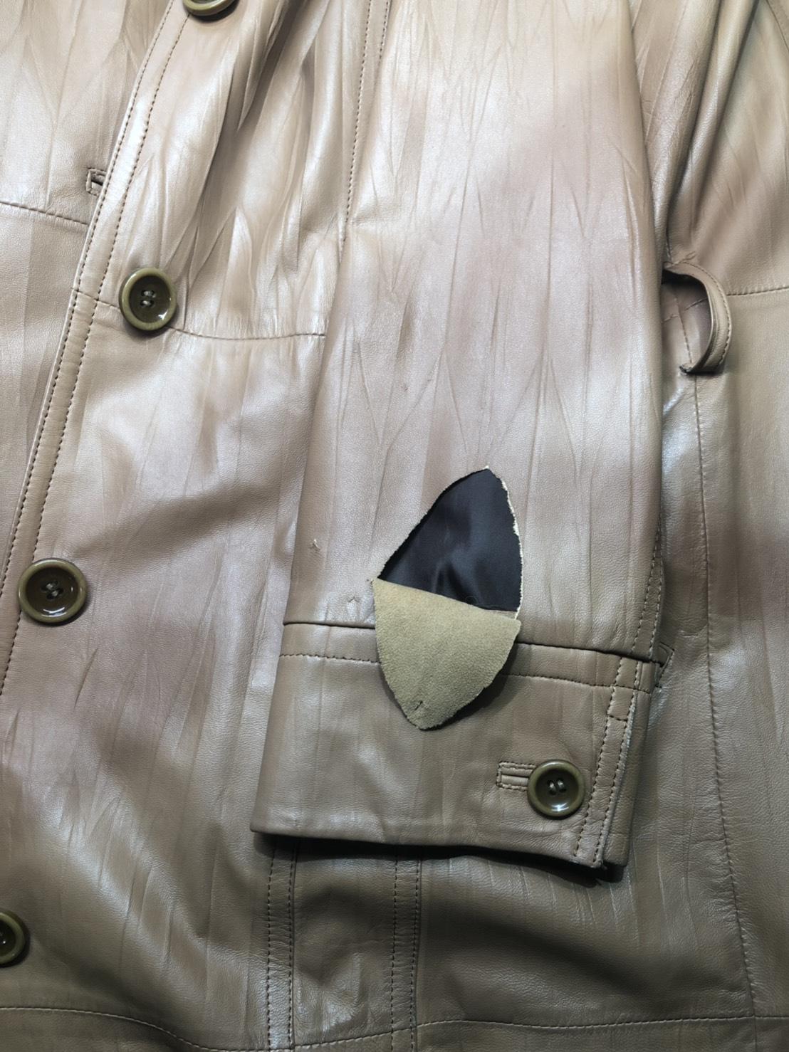 革コートの袖口付近の大きな破れ、細かい引っ掻き傷の補修。