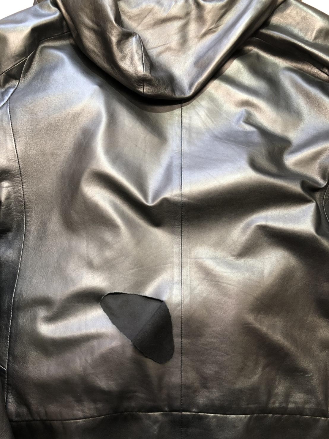 フード付きレザージャケット 背面の破れ補修。