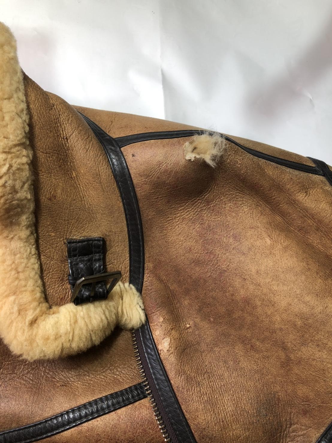 B-3ジャケット ムートンの破れ(穴)の補修。 裏地の毛を削いでパッチで補強、更に表地の破れ付近を数色使って目立たない様に隠ぺい。