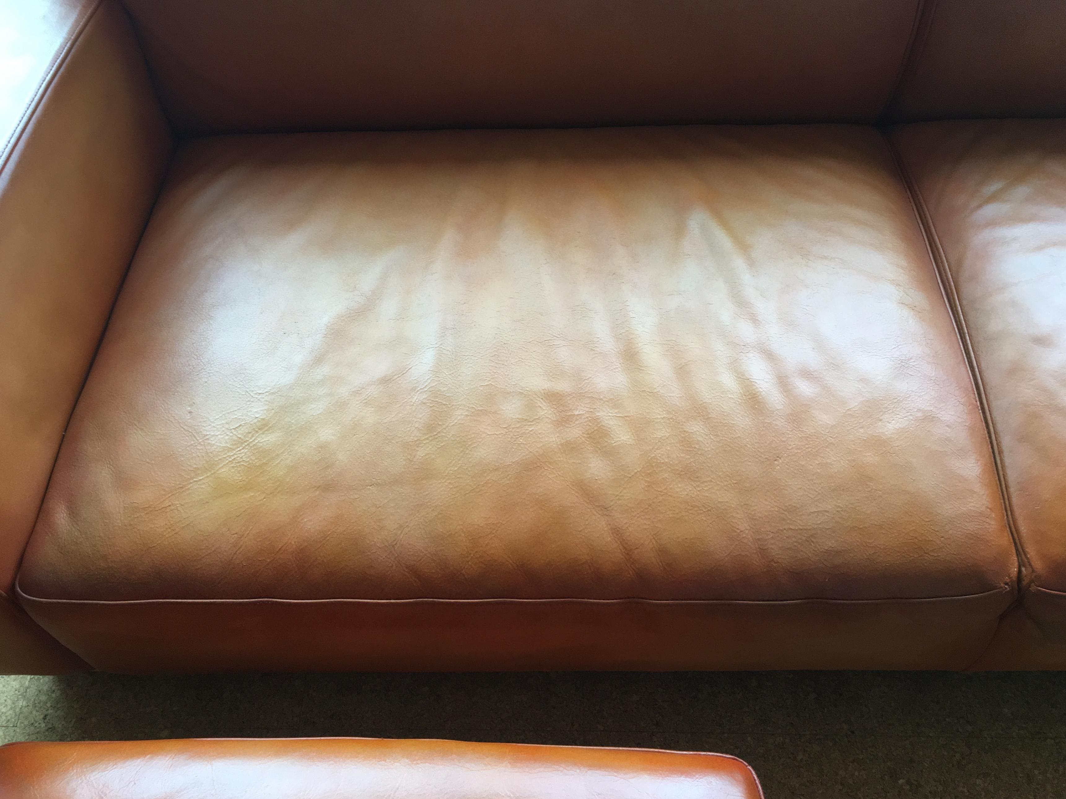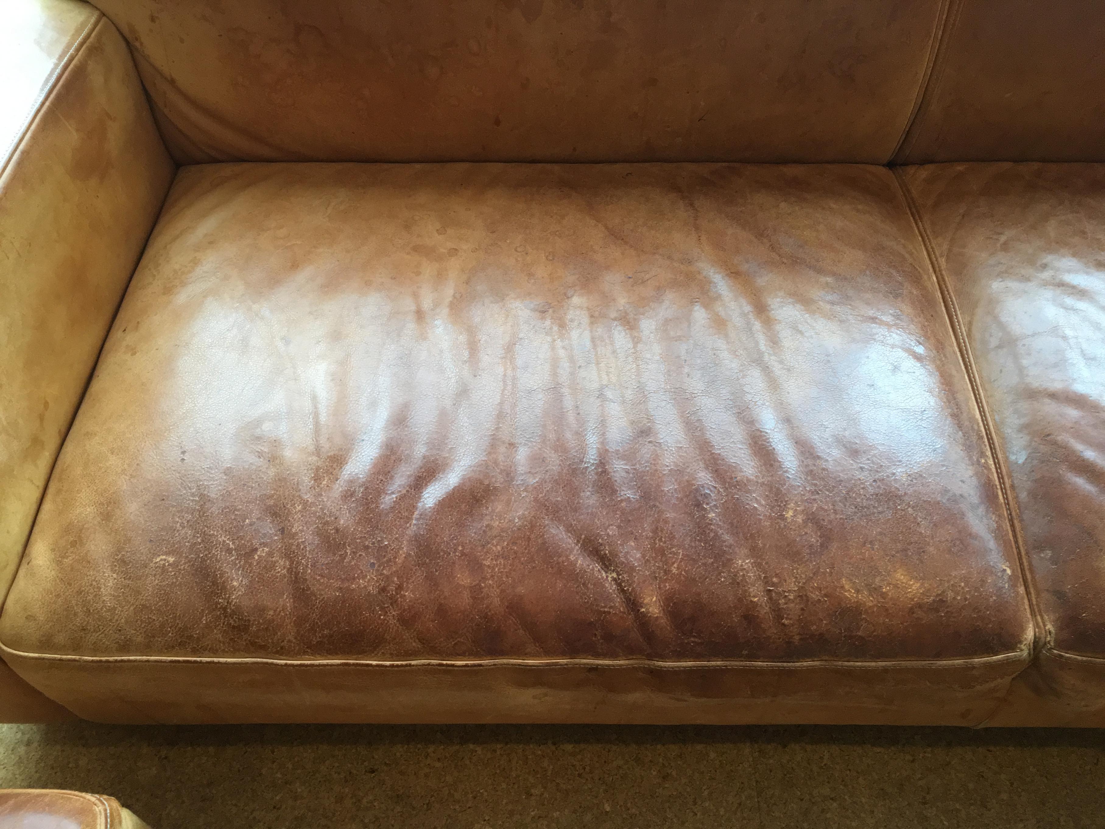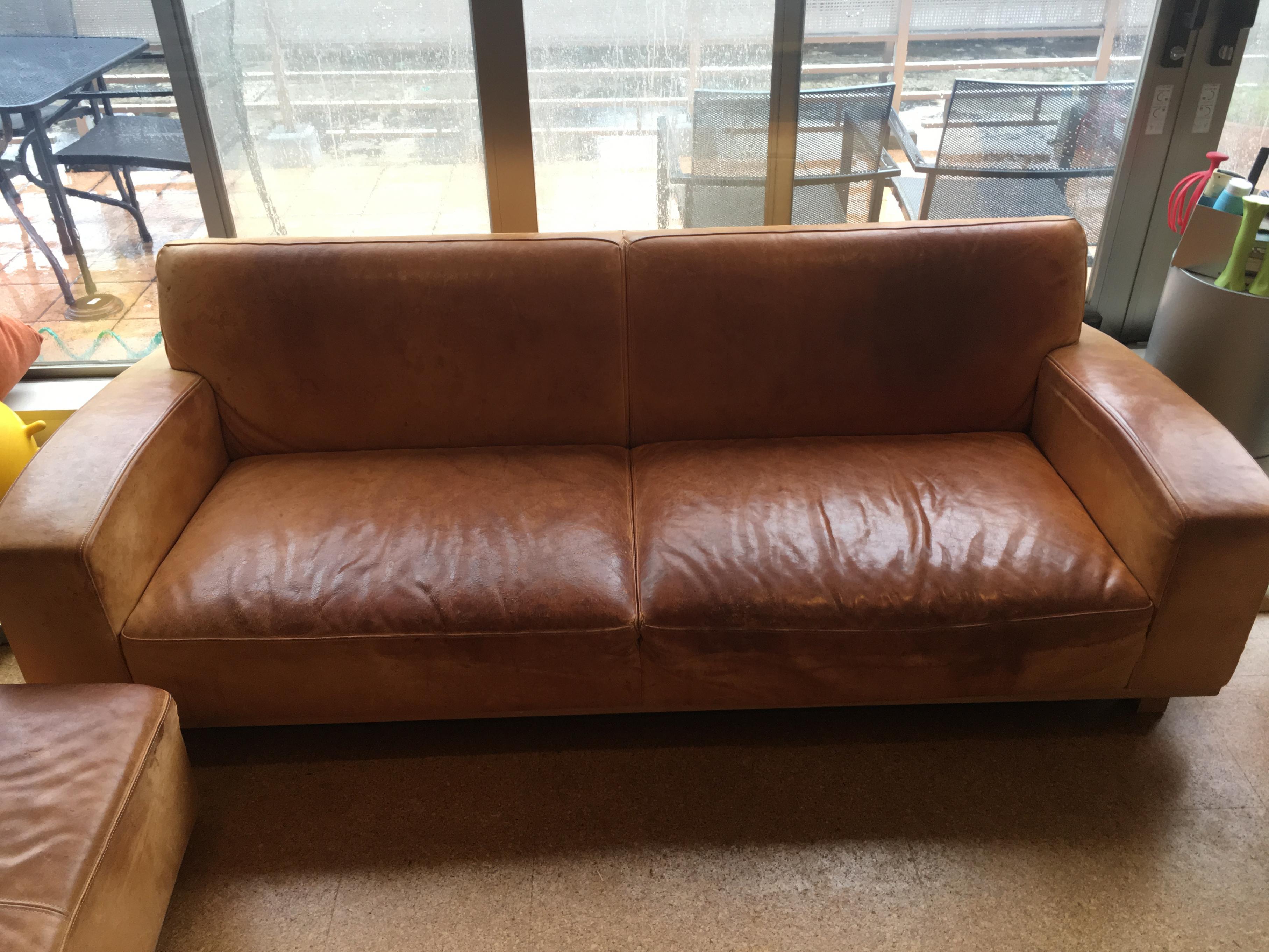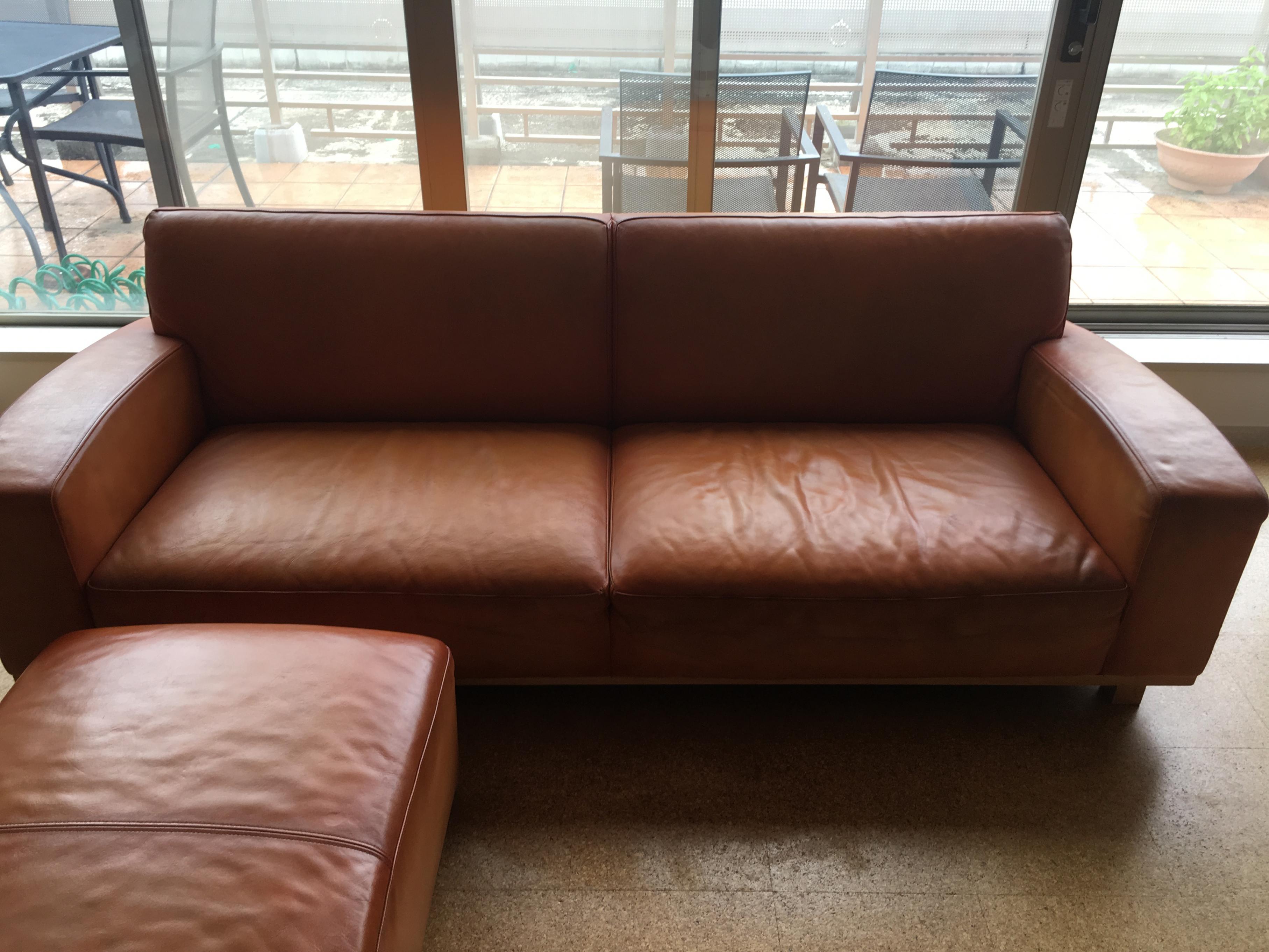 ヌメ革ソファ、オットマンの染め直し。オイルレザー風に濃淡をつけて仕上げ。