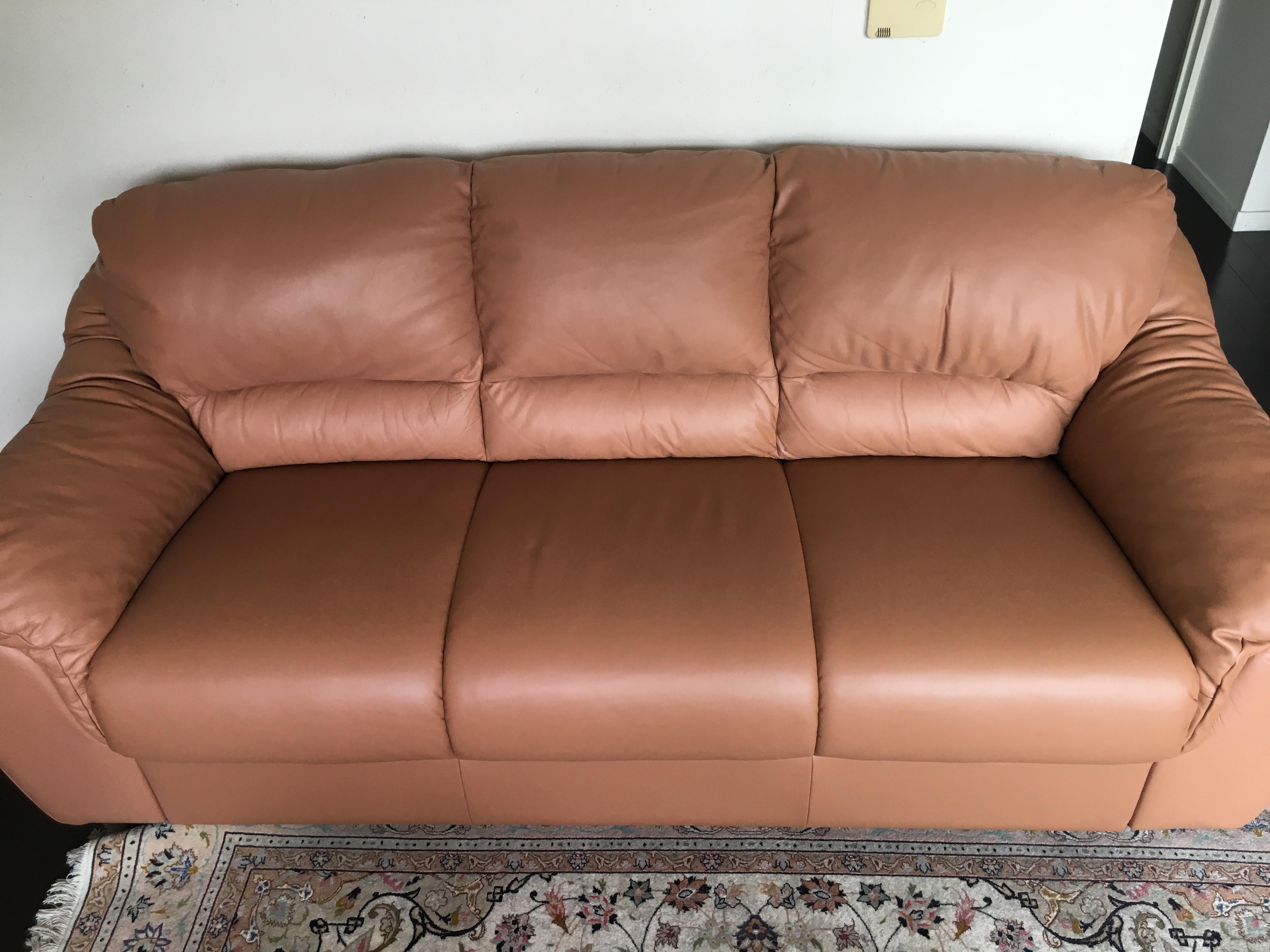 ソファセット 部分張り替え、染め直し加工。傷みのはげしい箇所は張り替え、その他ダメージの少ない箇所は新しい革に色を合わせて染め直し加工。