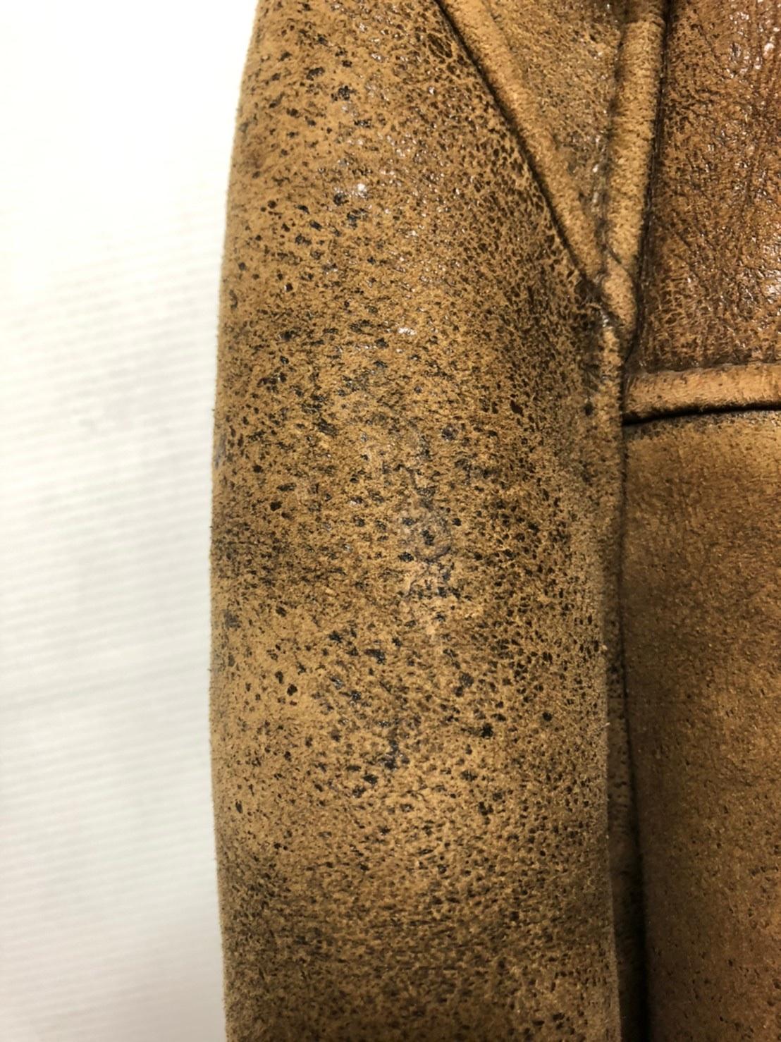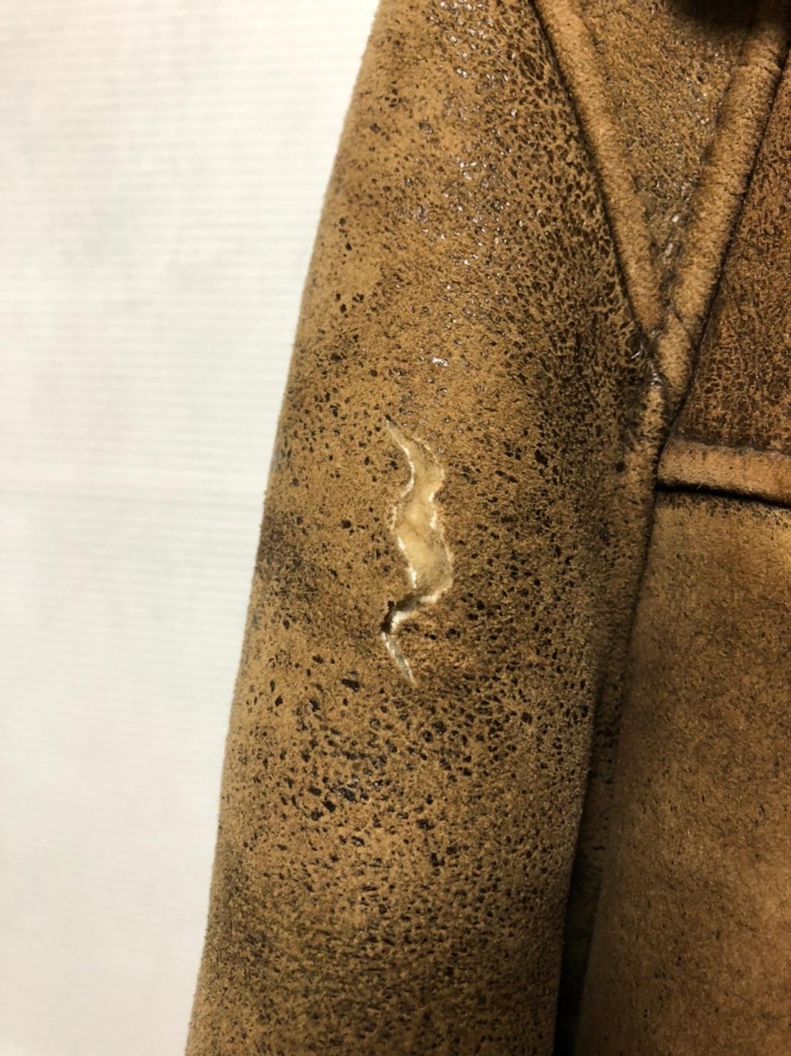 ムートンジャケット 破れの修理。破れた箇所を革の端材で裏当て、表面をエイジング加工。