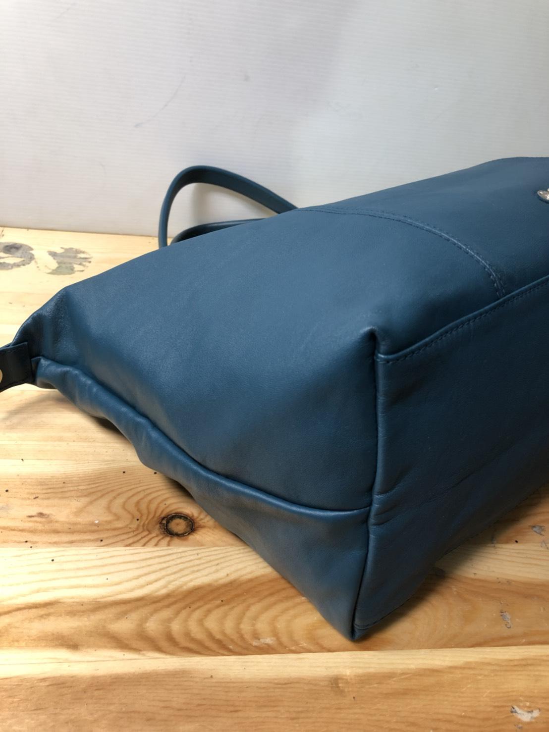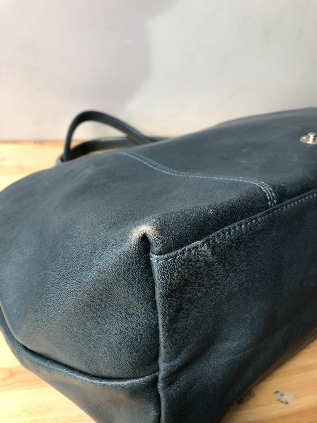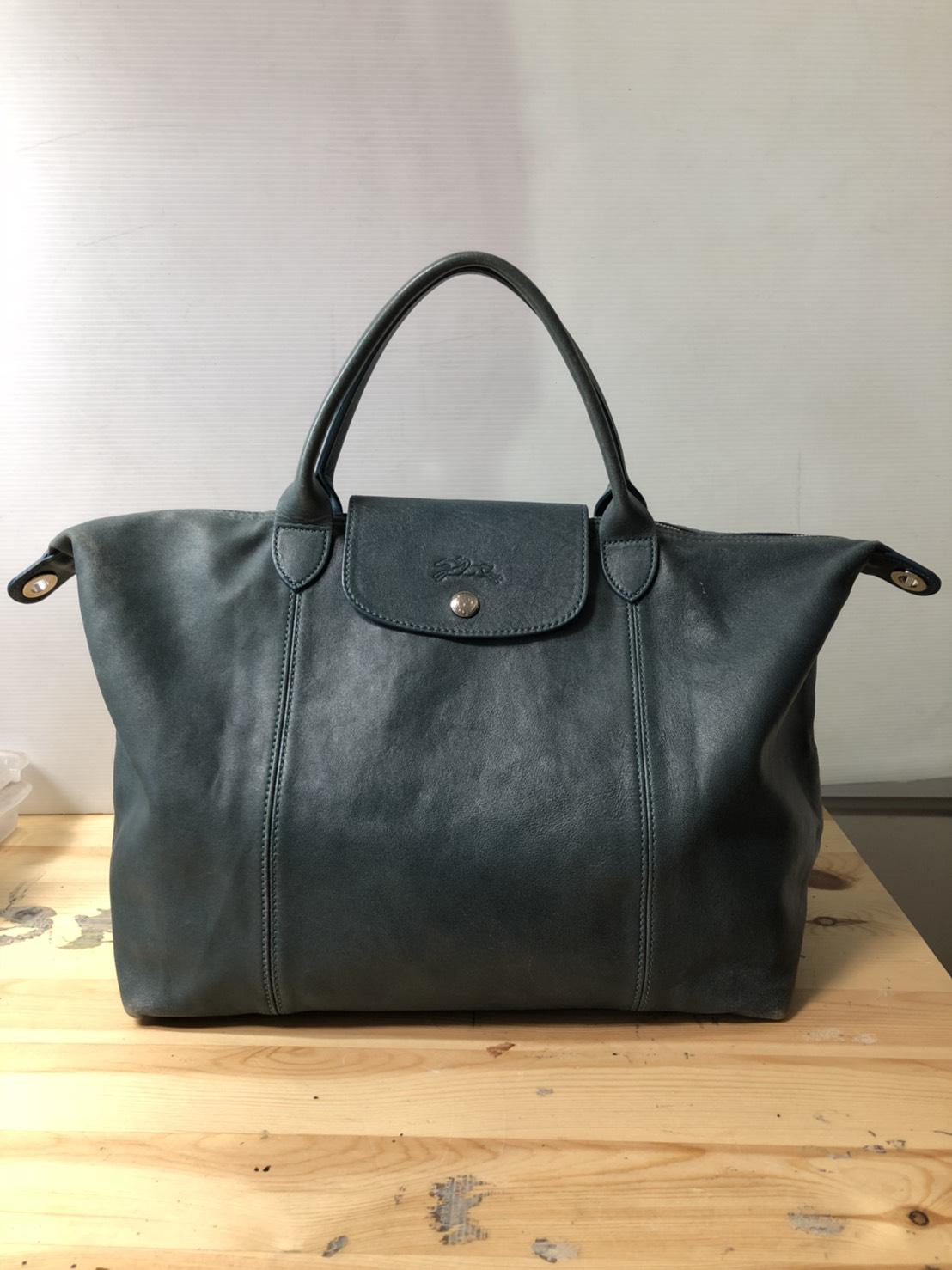 革バッグの全面染め直し修理。画像だとわかりづらいですが、全体的に小傷、黒ずみ、退色、擦れ等が有り。
