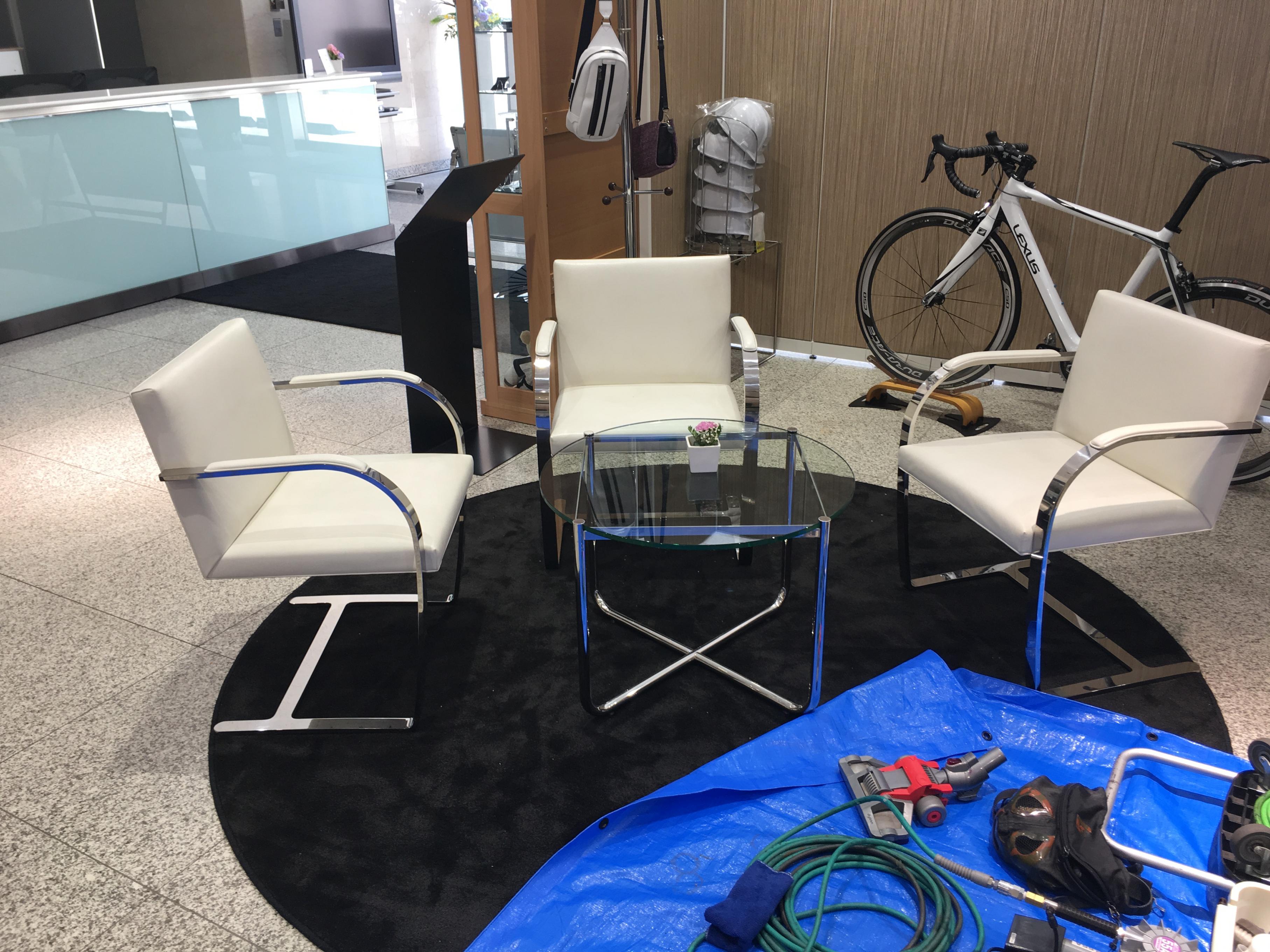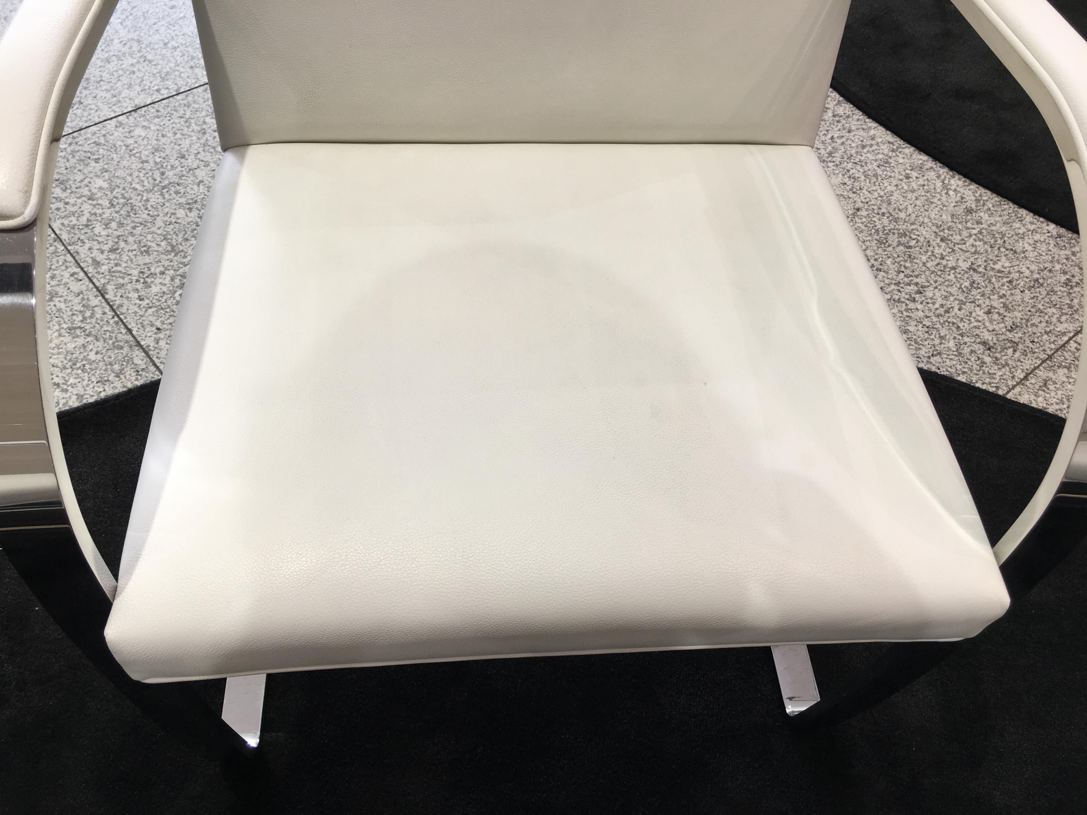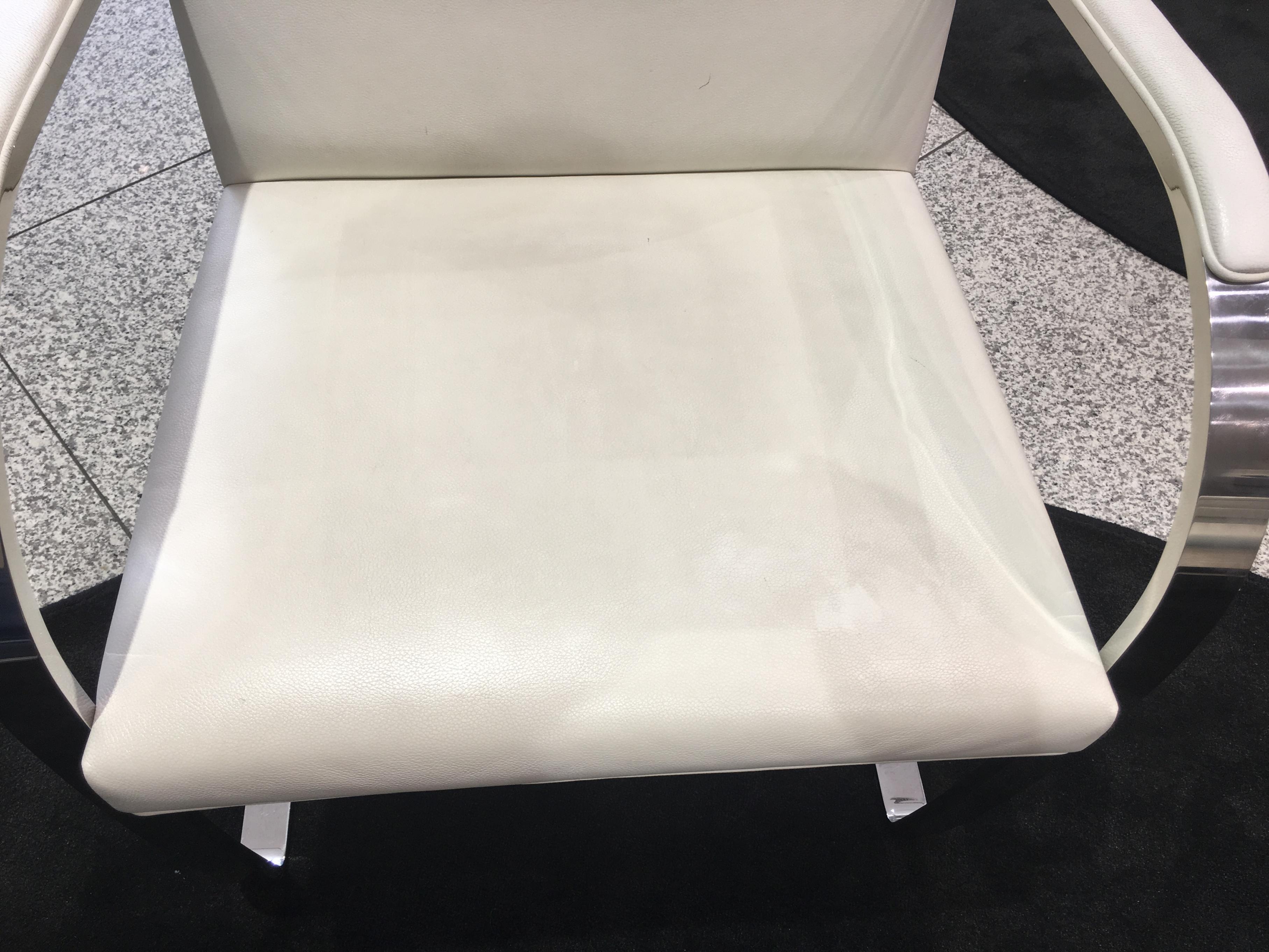 接客用アームチェアのクリーニング。本体は本革、肘、脚はスチール。オフホワイト色の為、