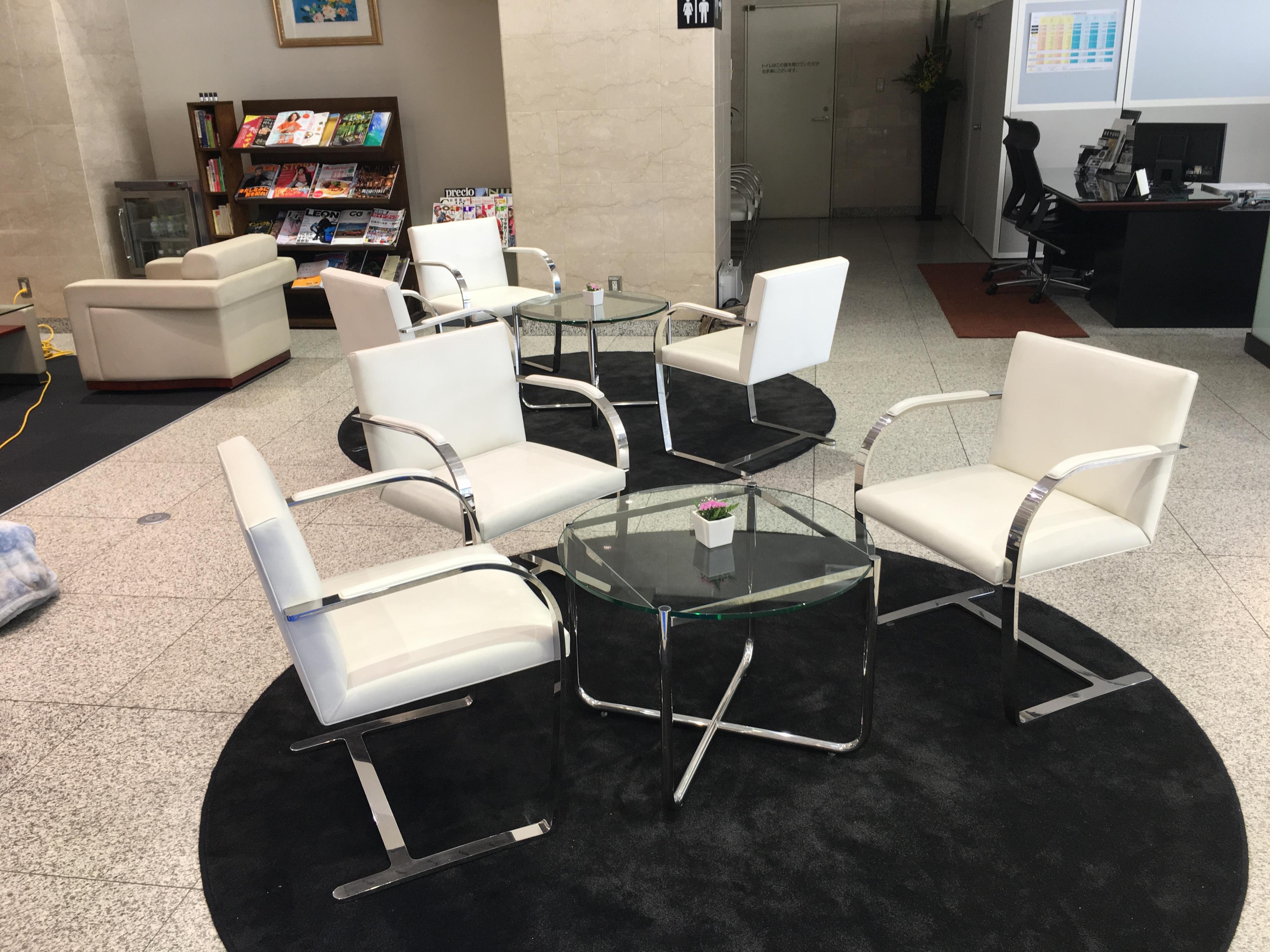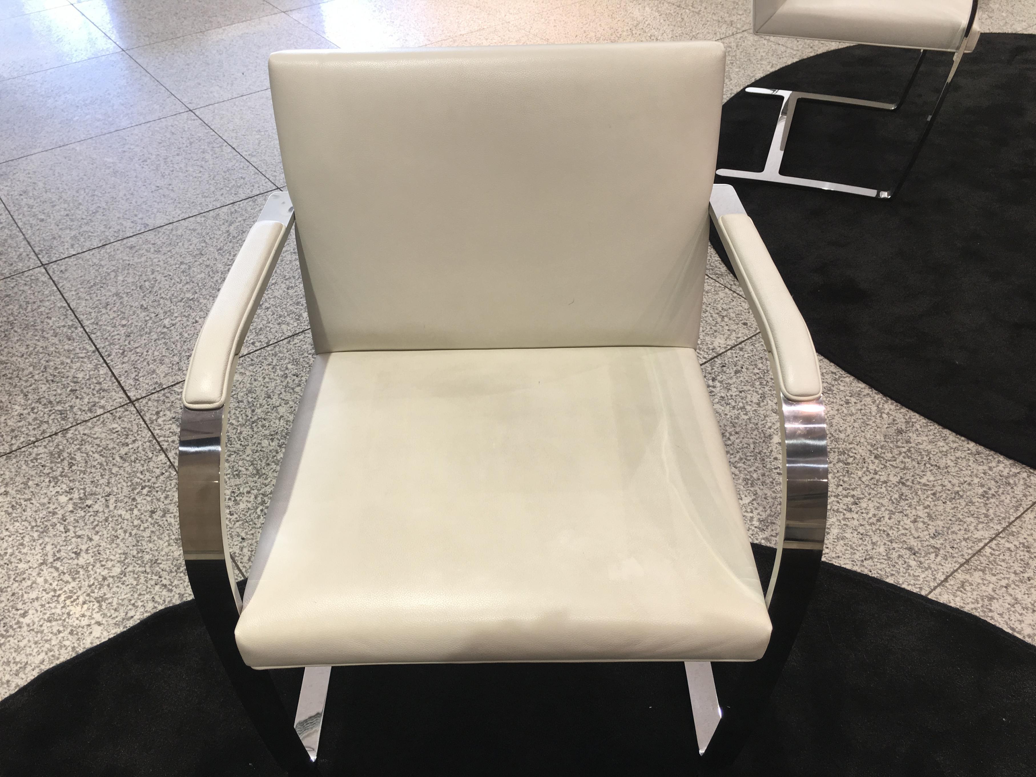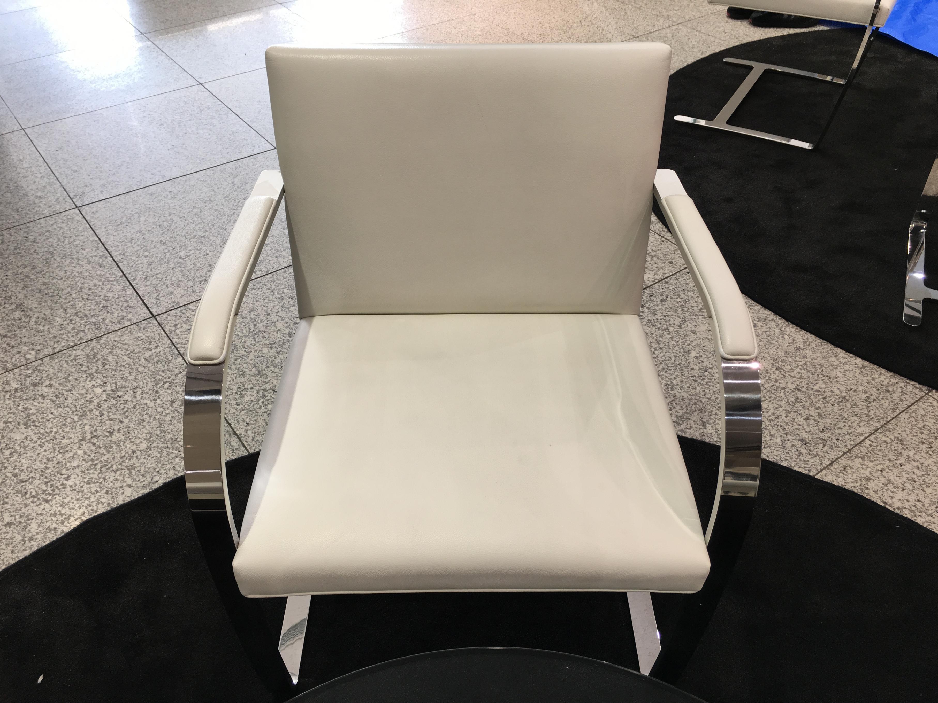 接客用アームチェアのクリーニング。本体は本革、肘、脚はスチール。オフホワイト色の為、