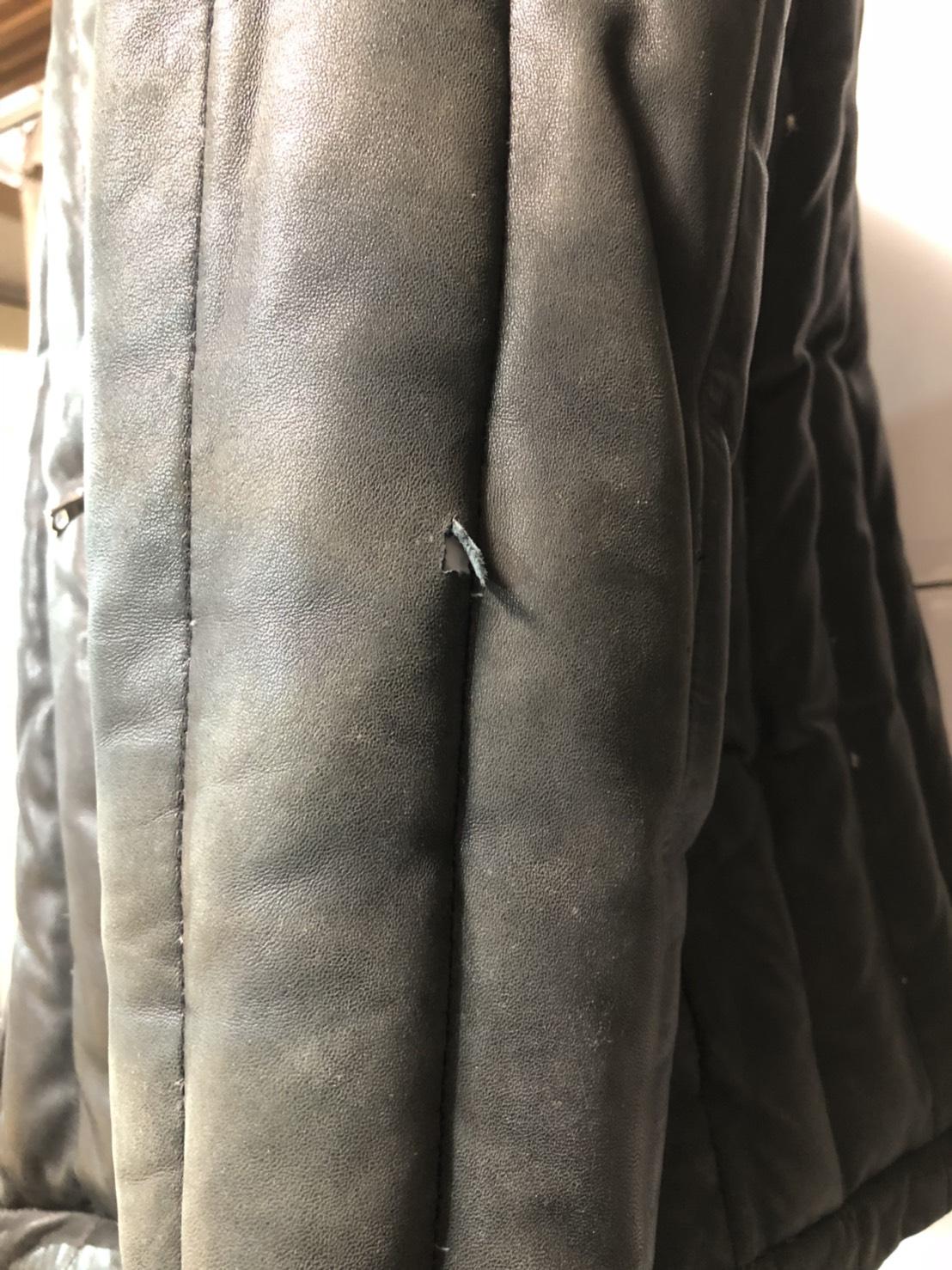 ![]() ![]() 【神奈川県厚木市のお客様よりご依頼】 レザージャケット左袖の破れ。一番ご相談が多いのがこの様な破れです。出来るだけ痕跡が目立たなくなる様に行ないます。 |