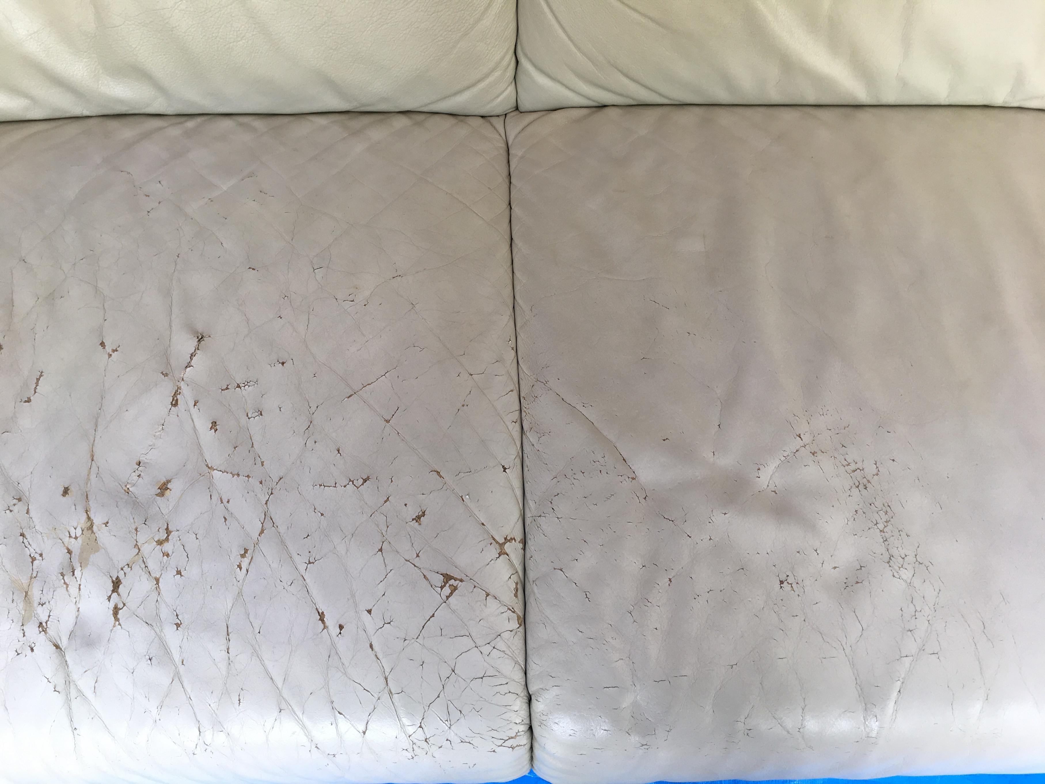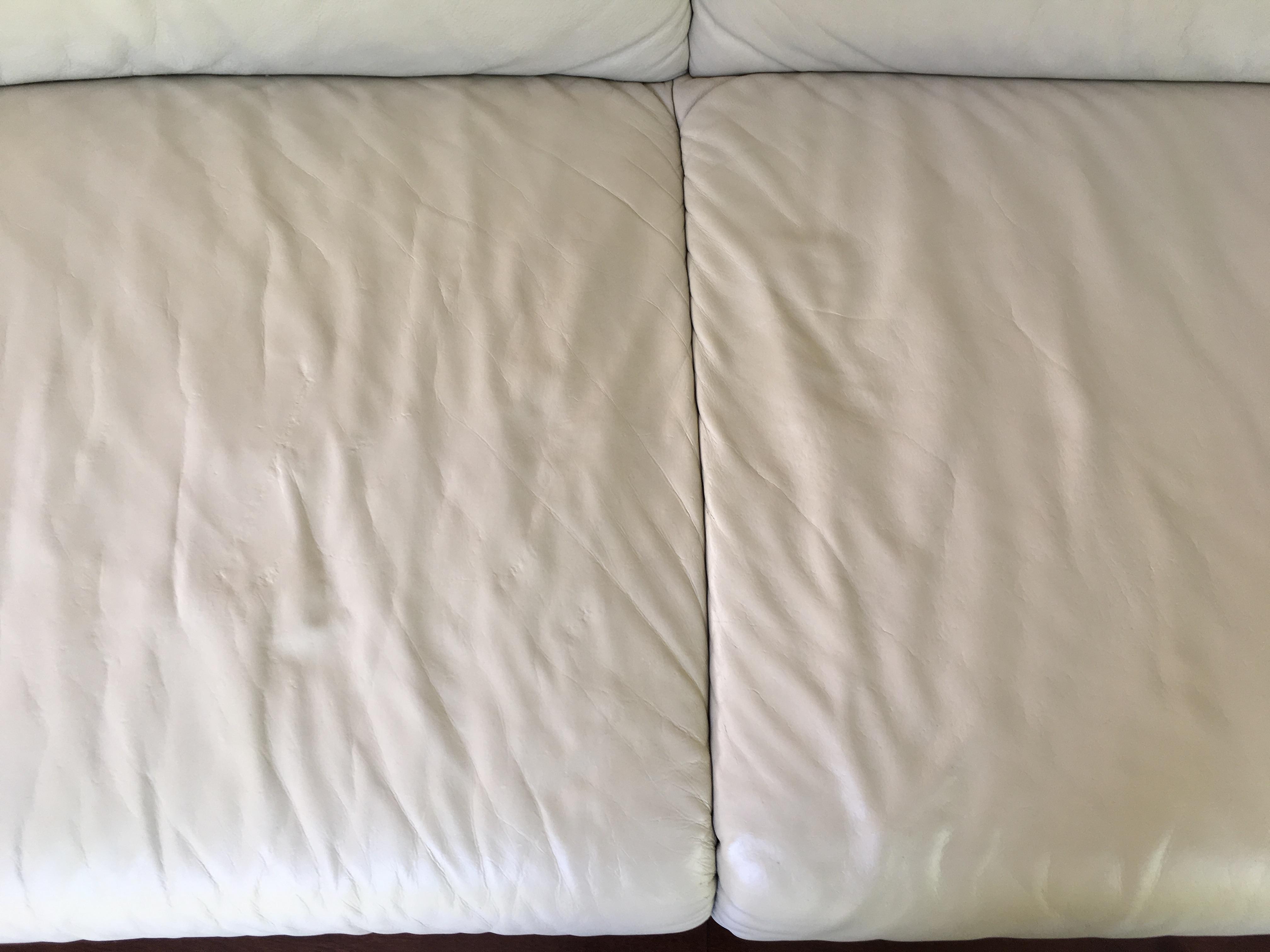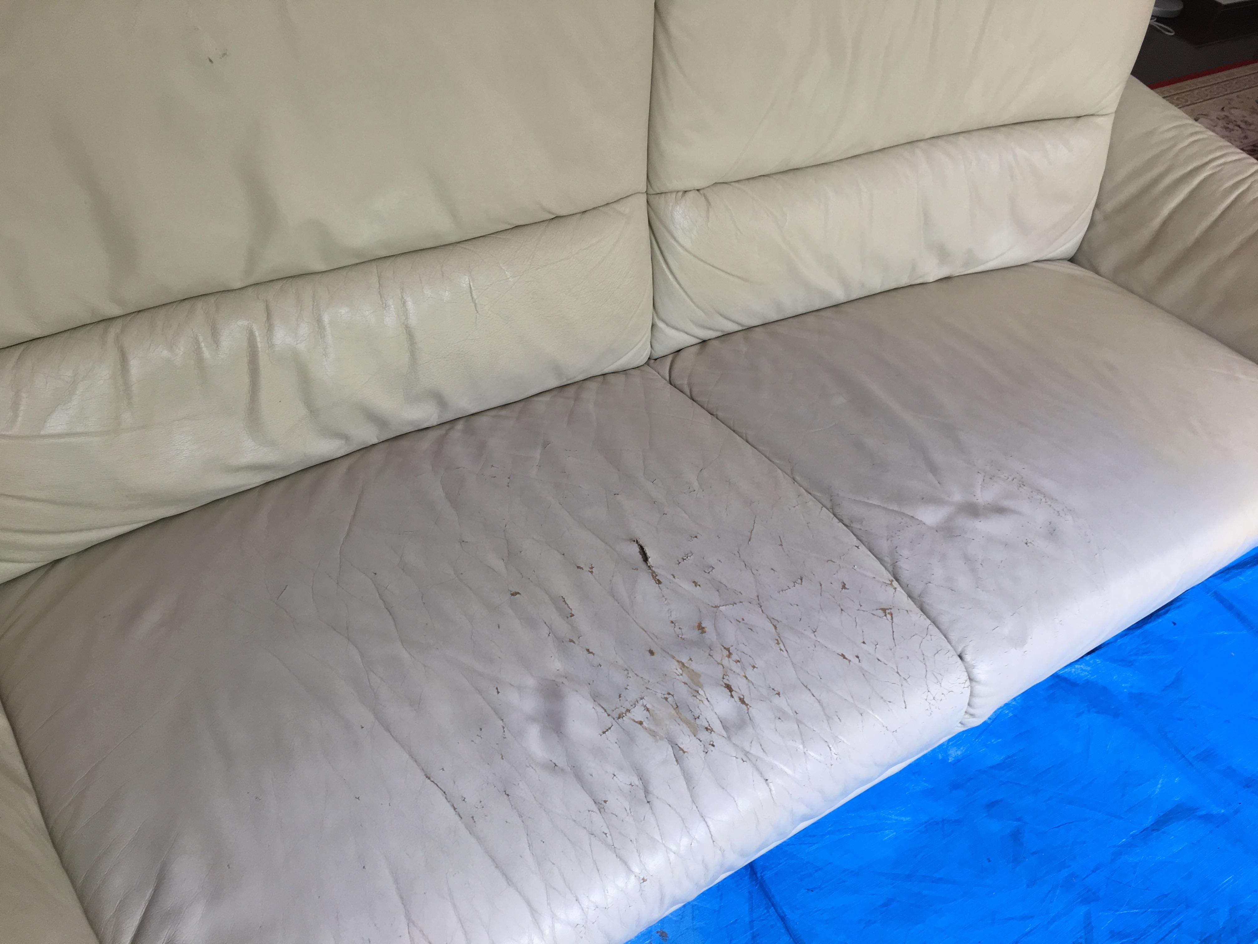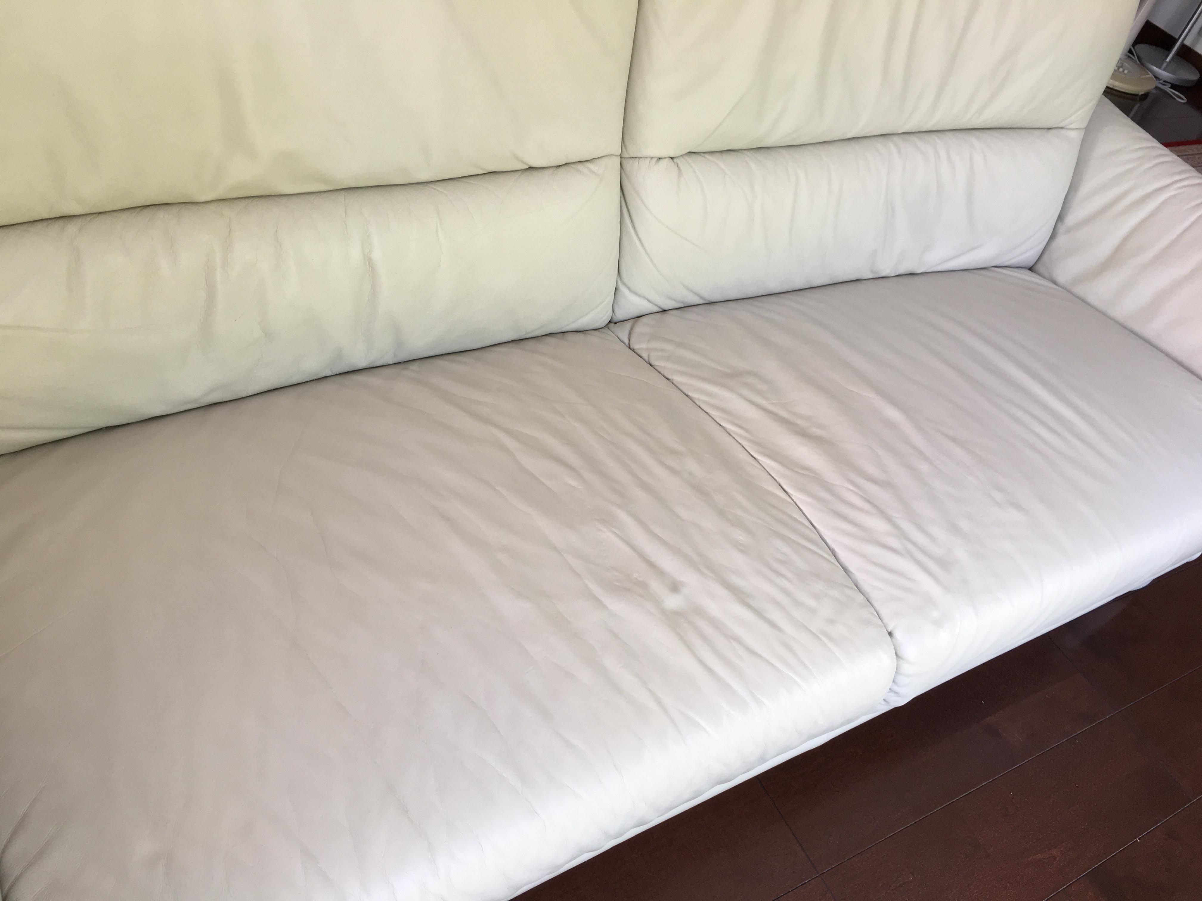 ソファ座面の革劣化、汚れ等の改善。色はアイボリー。劣化、汚れ共に大変目立つ色です。