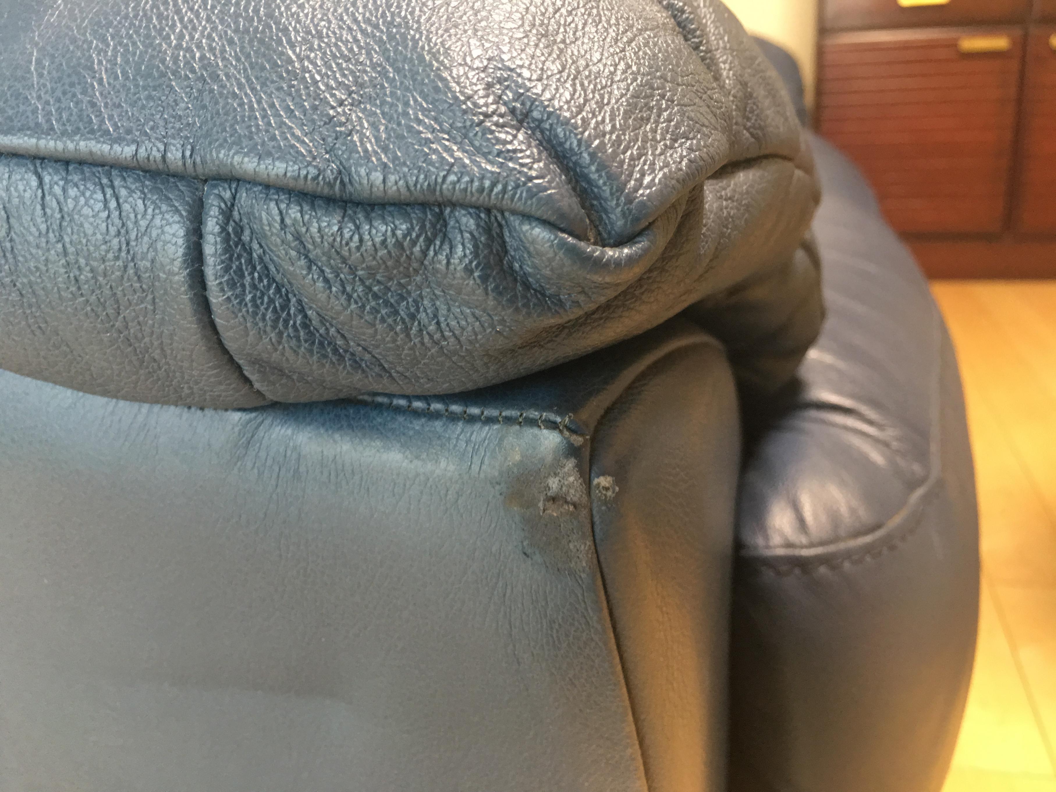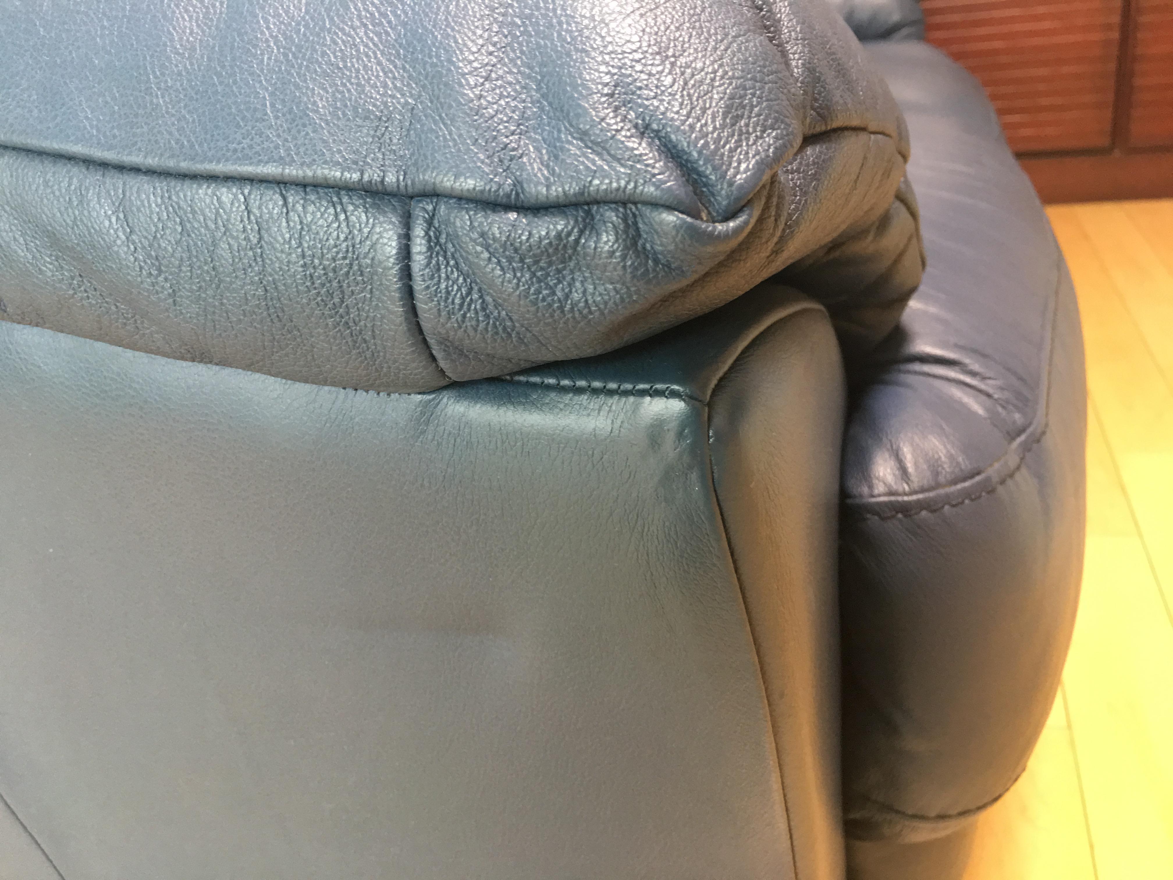 革張りソファ コーナー部分の擦り切れ直し。 搬送中にできた損傷の様です。幸いに深いダメージはなかったので、ほぼ気にならないレベルに修復。