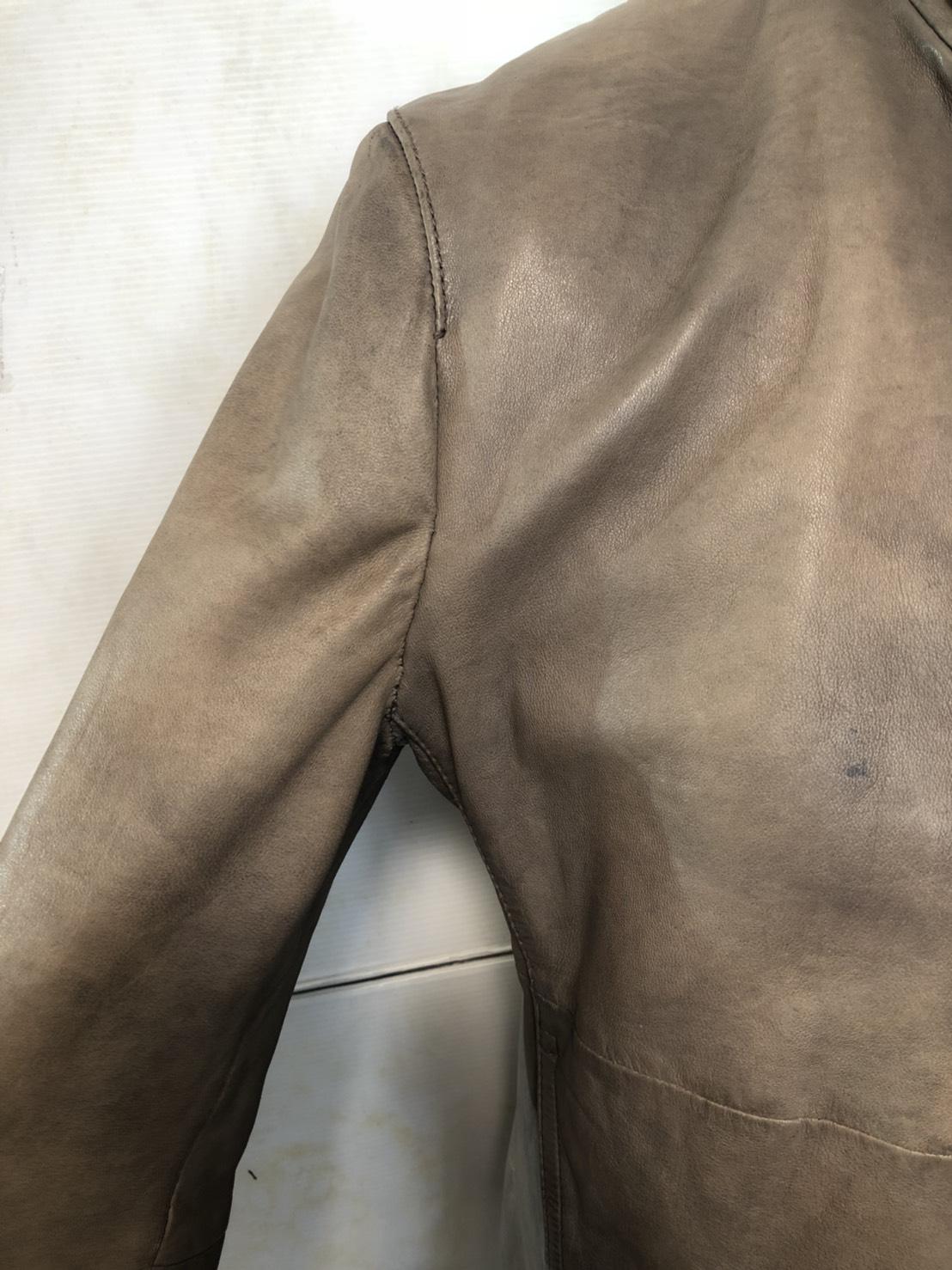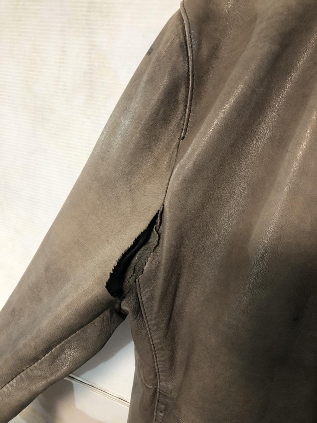 革ジャケット アームホール脇の破れ直し。タイトフィットなデザインの場合、このようなバッククラッシュをおこすことが非常に多くあります。