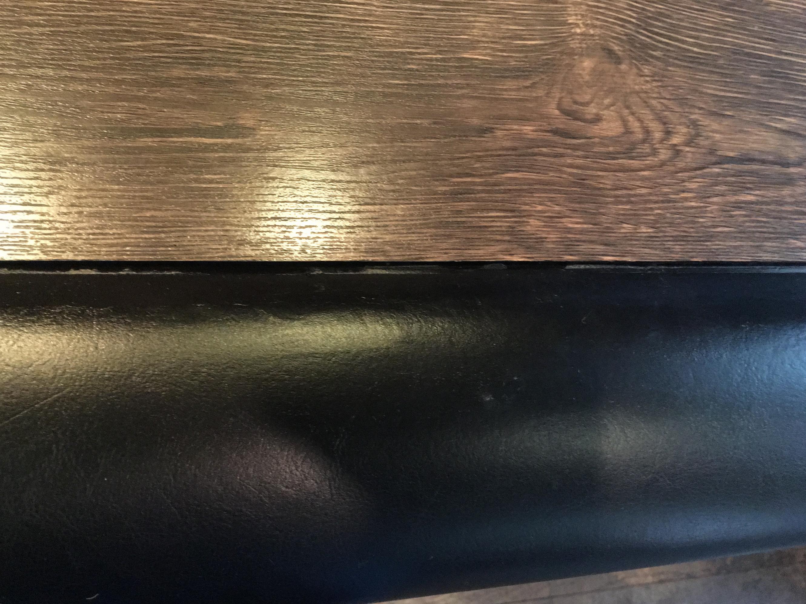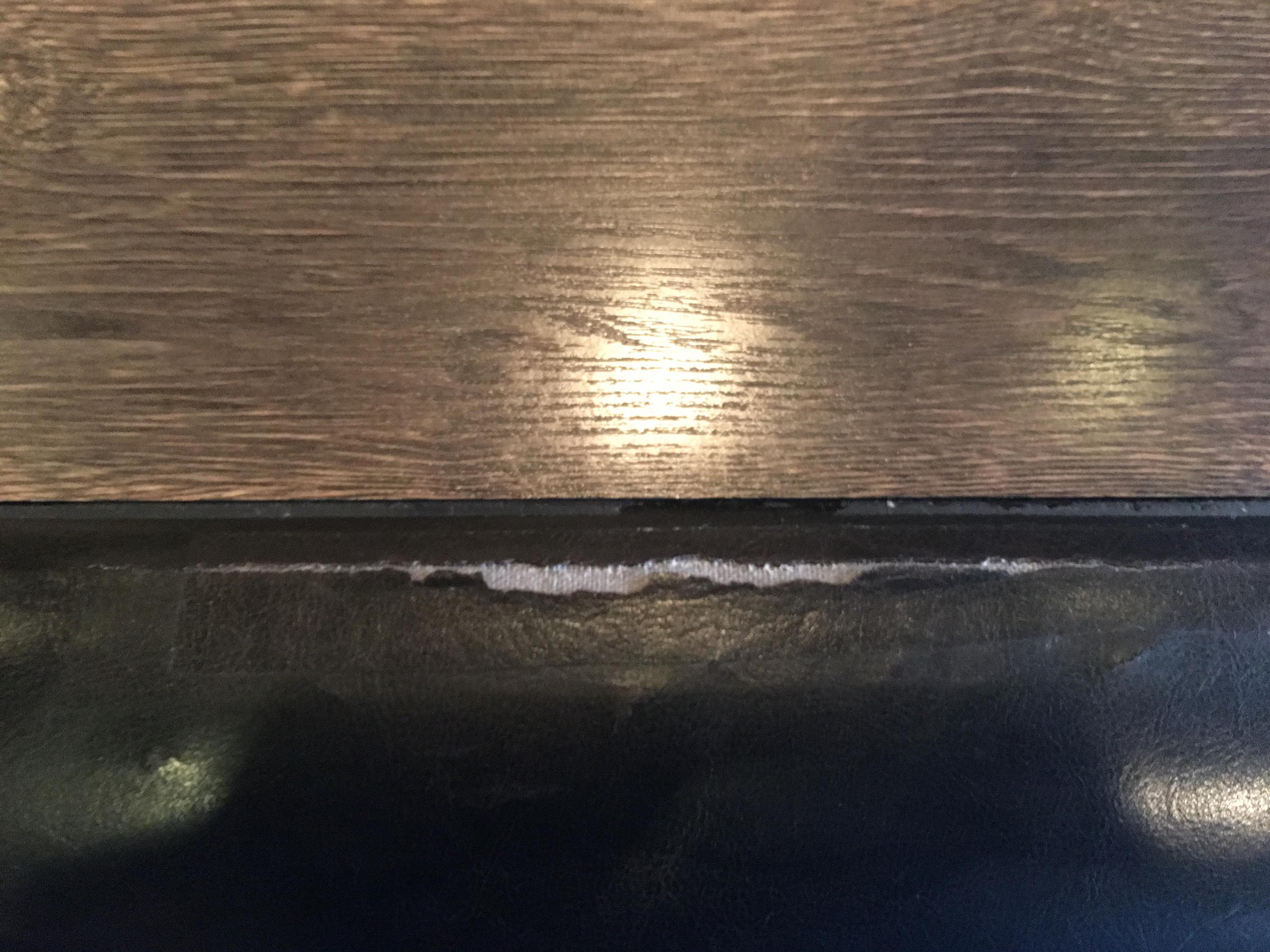 バーカウンターの前面ビニールレザーの破れ直しのご依頼。 経年劣化で表皮が欠損した状態。充填剤で埋めて表面仕上げ、ウレタン加工を行なってます。