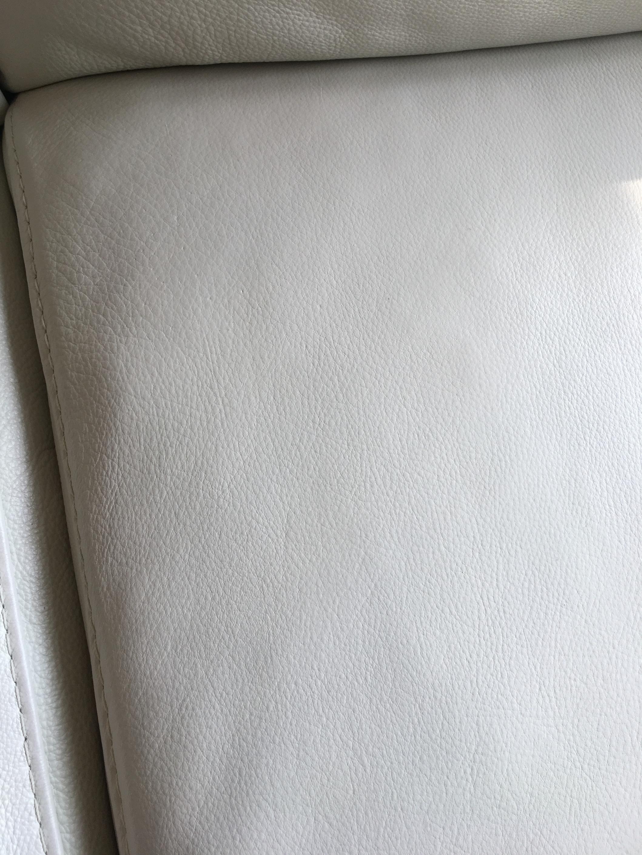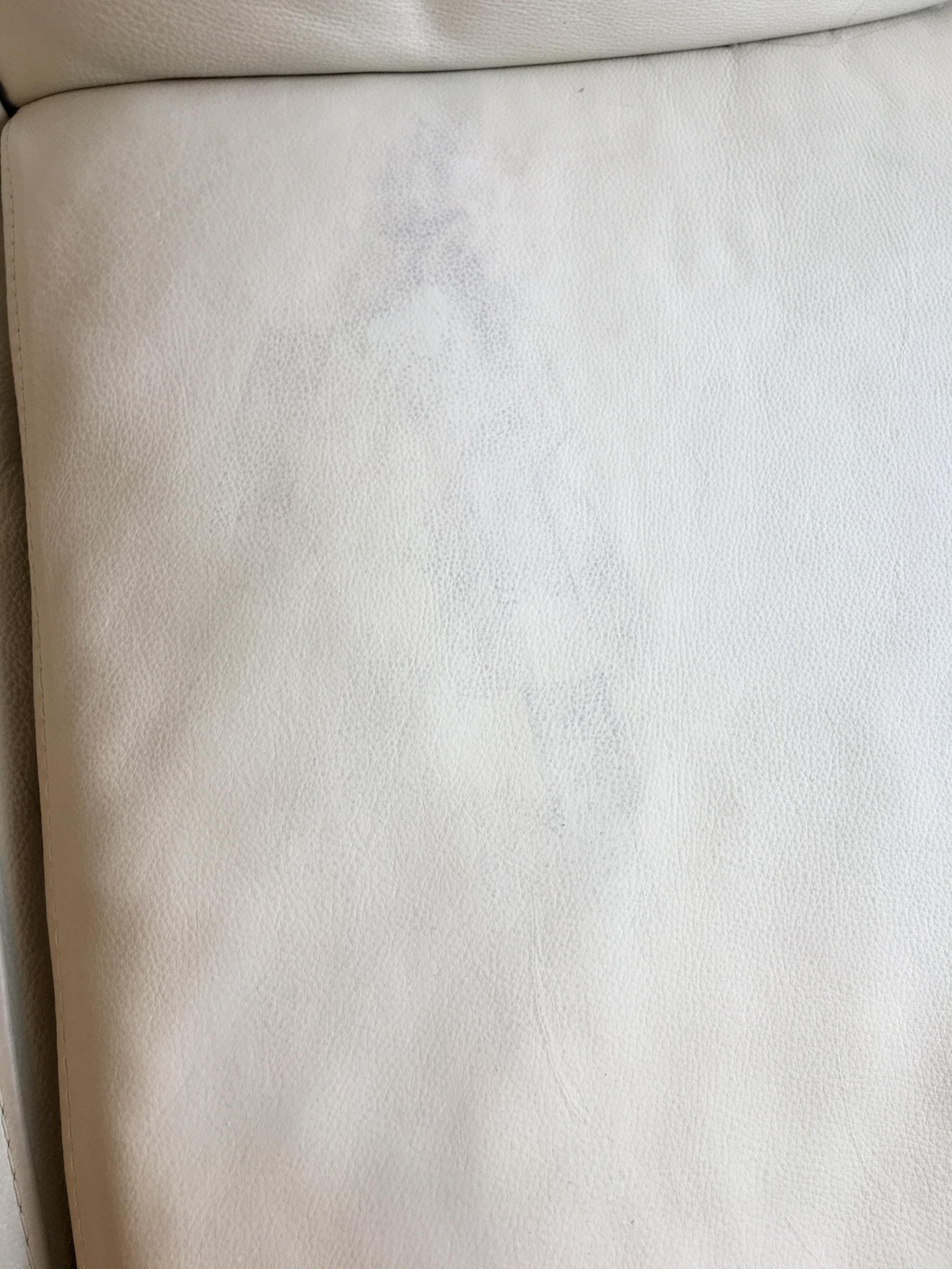 本革ソファ 座面のインク痕の除去。専用クリーナーで落とせるところまで除去してから、部分染めを行なってます。