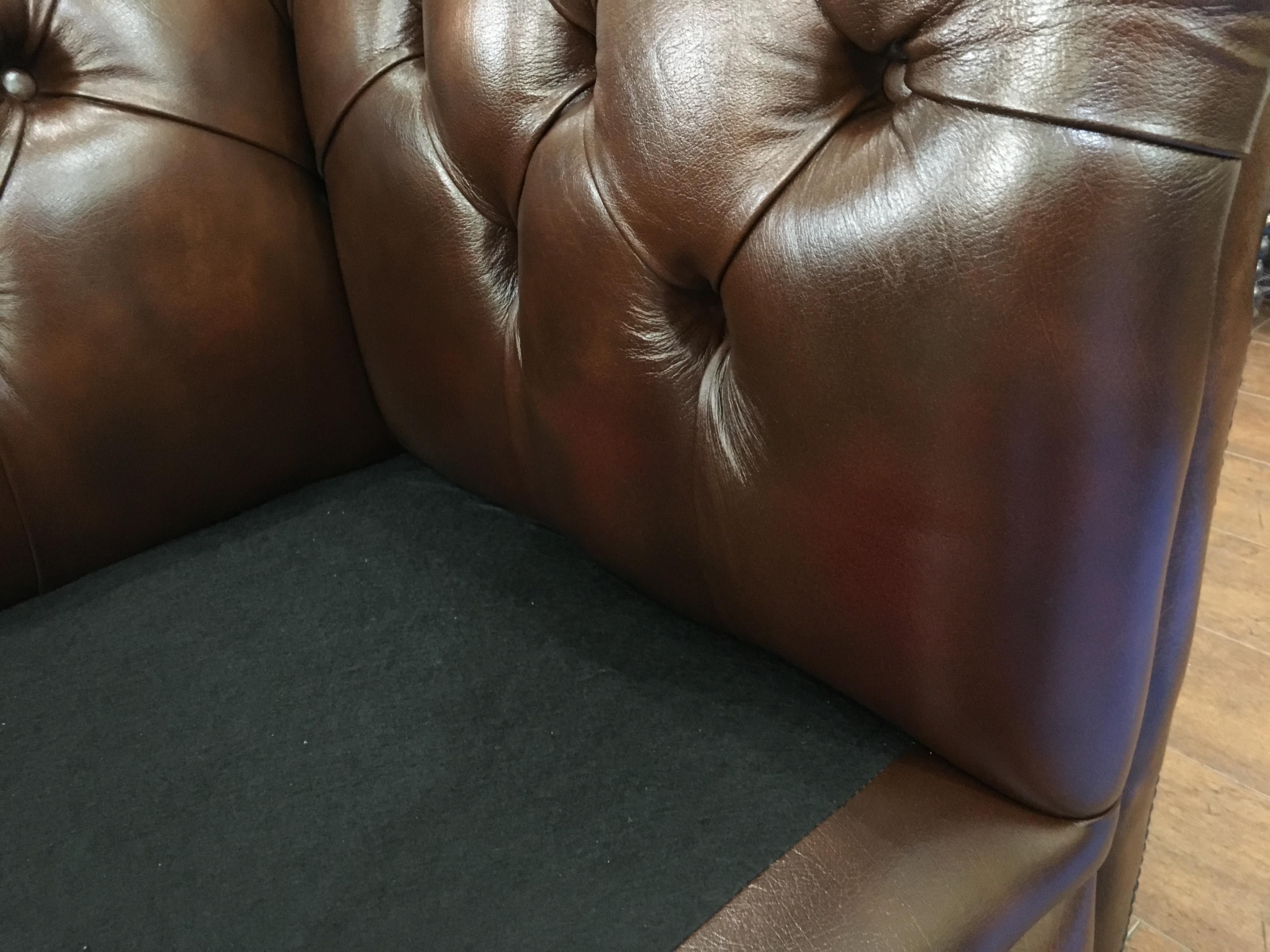 チェスターフィールドの3人掛けソファ 座面と本体の合わせ面の色補正。