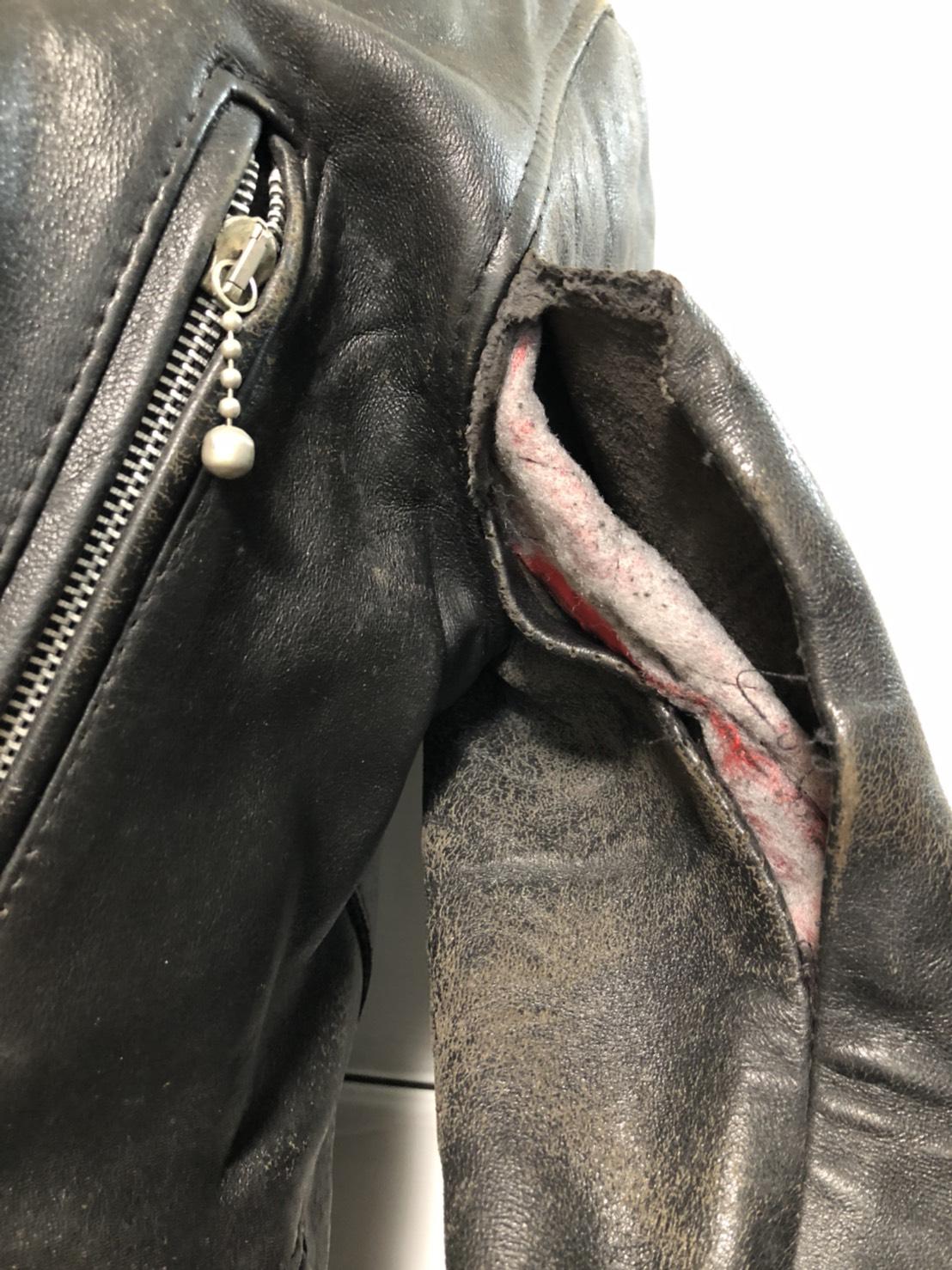 レザーライダースジャケット アームホールから腕にかけてほつれ・破れ有り。内側からパッチで補強、縫い直し。