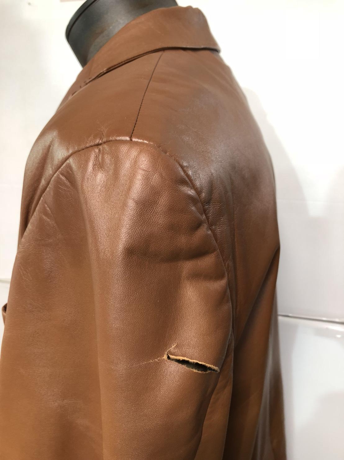 革ジャケット 左腕破れの修理。破れ目に革パッチを内側から当てて補強、表面を目立たなく補修。