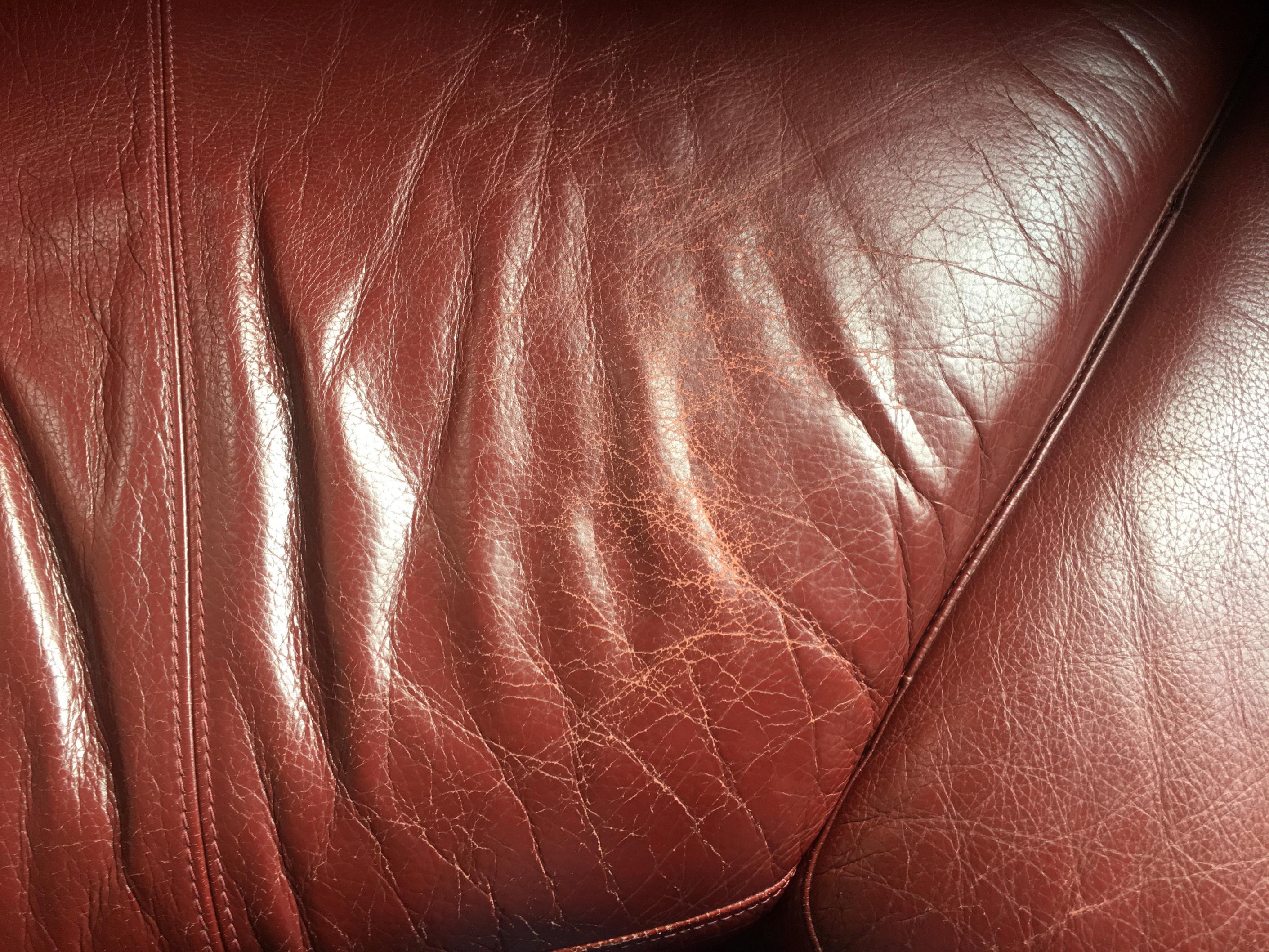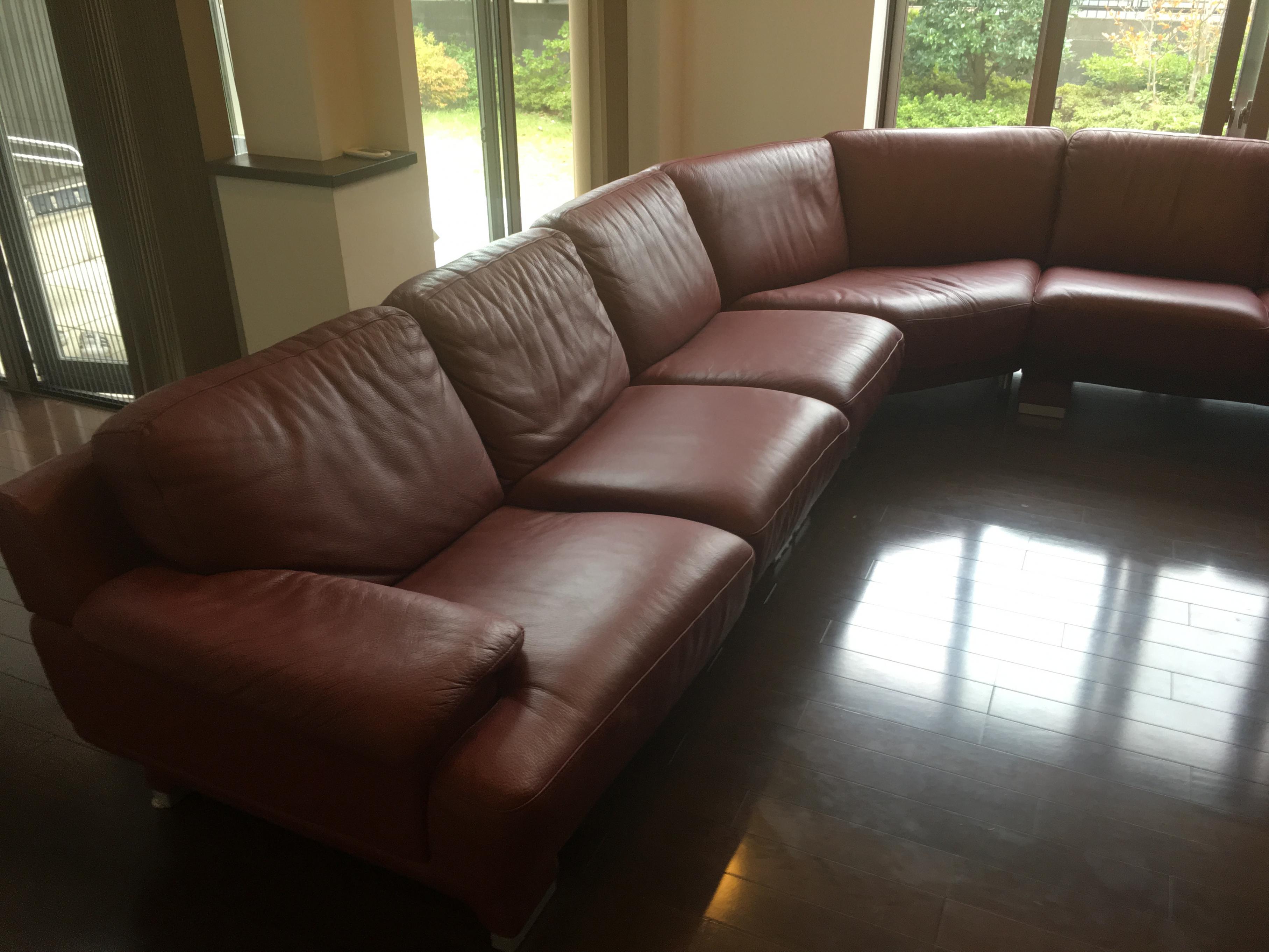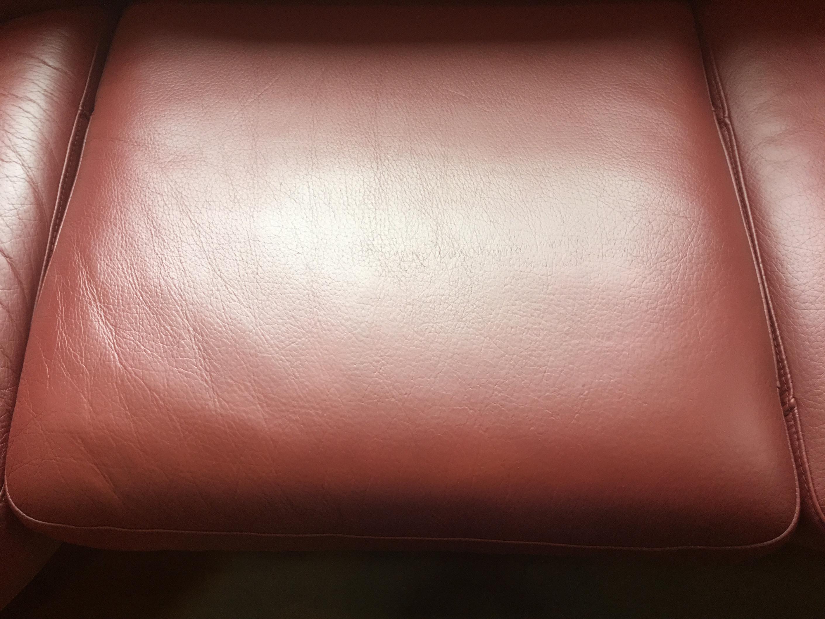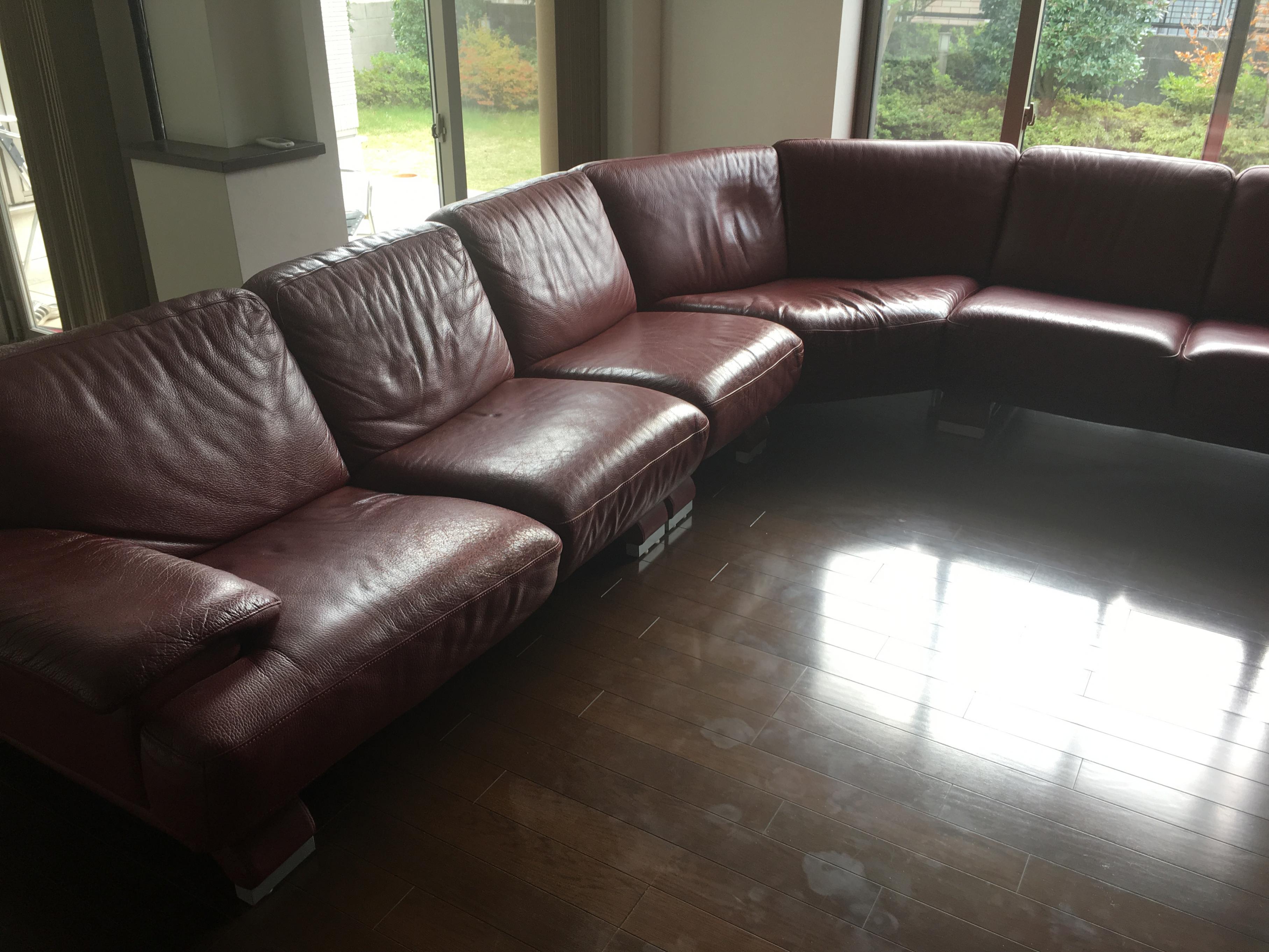 ソファ6点セットの革劣化補修及びクリーニング。皮脂汚れの黒ずみ・テカりを解消した時点でも驚くほど風合いが復活。