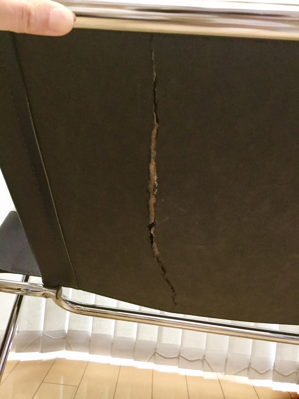 ワシリーチェアの座面下部の裂け。パイプユニットに厚手の革を通して組み立てる仕様。