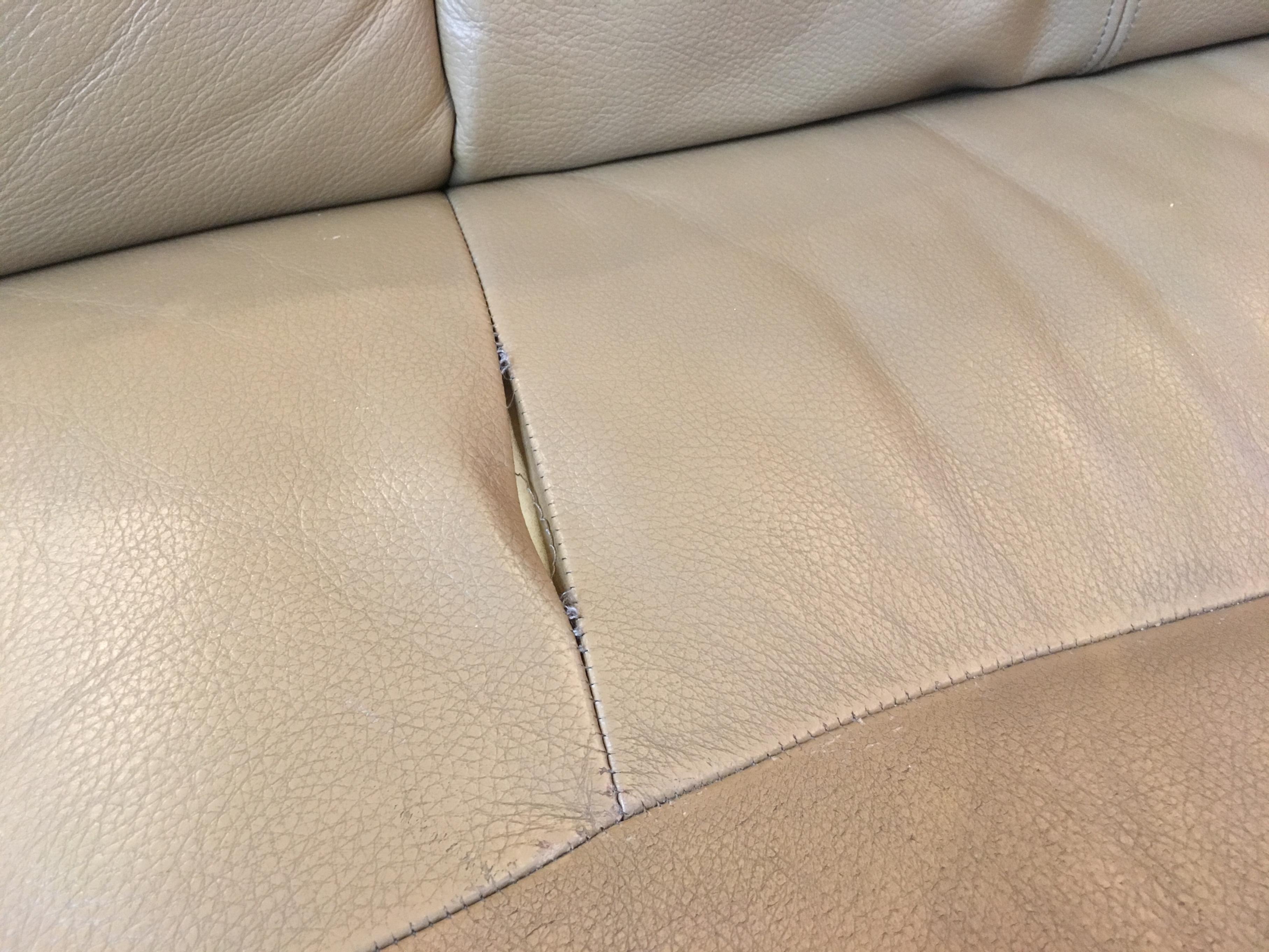 カリモク製ソファ座面の一部ほつれ。現地施工にてご対応致しました。