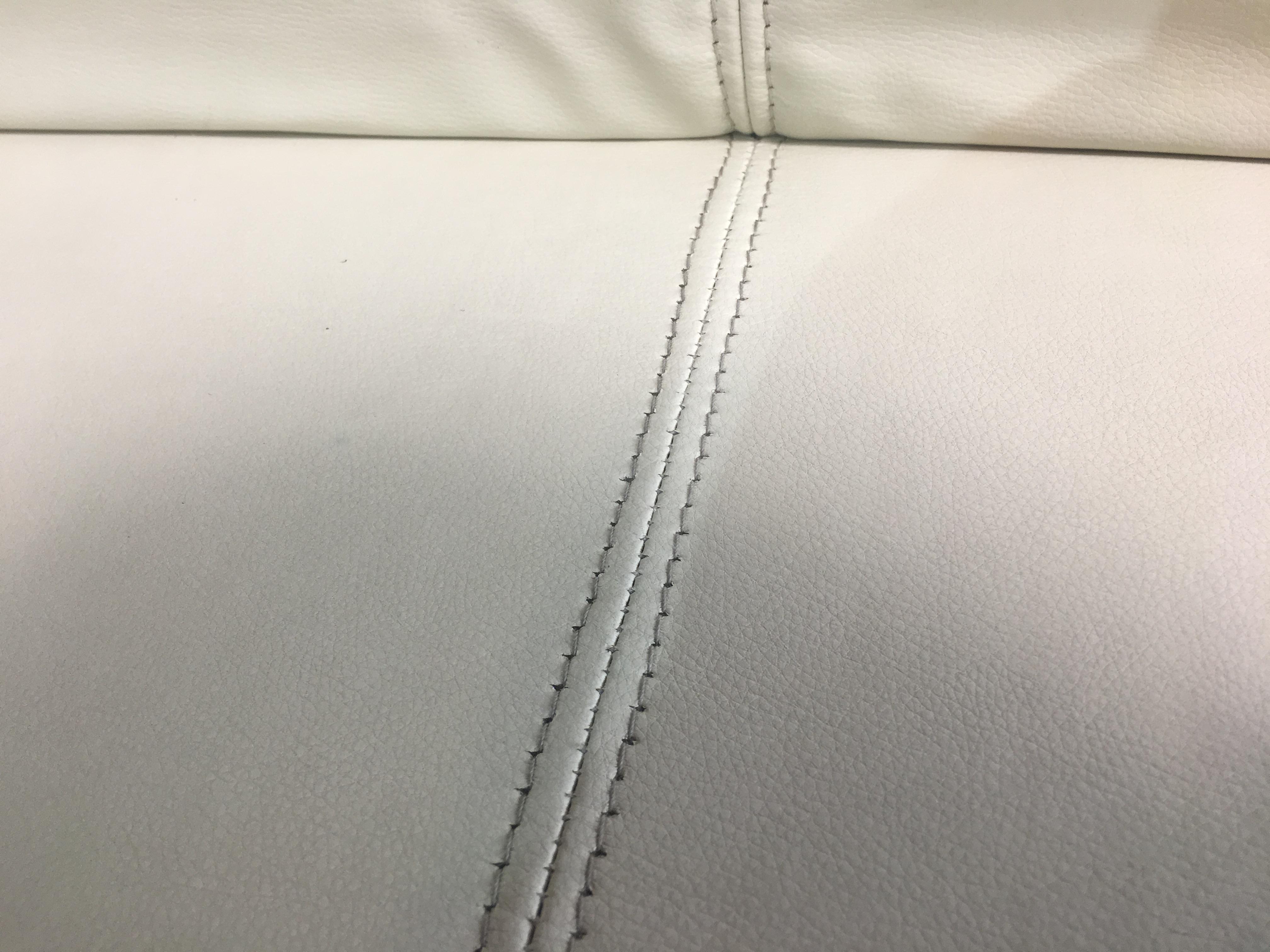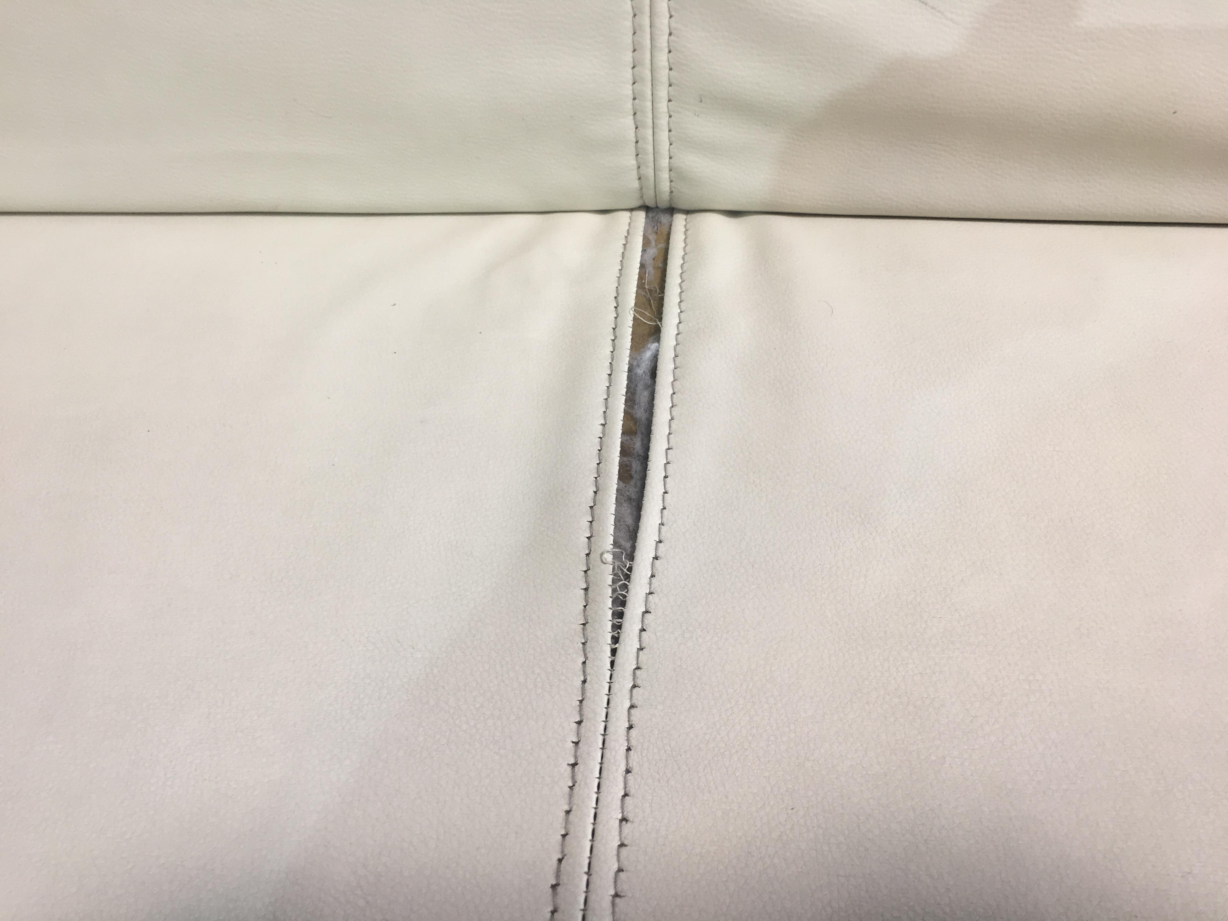 KOSUGA製 革張りソファの座面中央ほつれ直し。テンションがかかって大きく開いた状態。